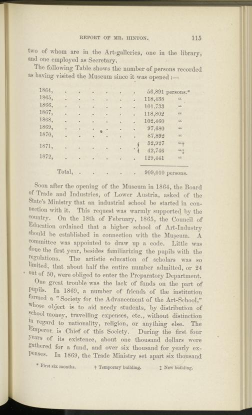 Soon after the opening of the Museum in 1864, the Board of Trade and Industries, of Lower Austria, asked of the State’s Ministry that an industrial school be started in connection with it. This request was warmly supported by the country. On the 18th of February, 1865, the Council of Education ordained that a higher school of Art-Industry should be established in connection with the Museum. A committee was appointed to draw up a code. Little was done the first year, besides familiarizing the pupils with the regulations. The artistic education of scholars was so limited, that about half the entire number admitted, or 24 • out of 50, were obliged to enter the Preparatory Department.