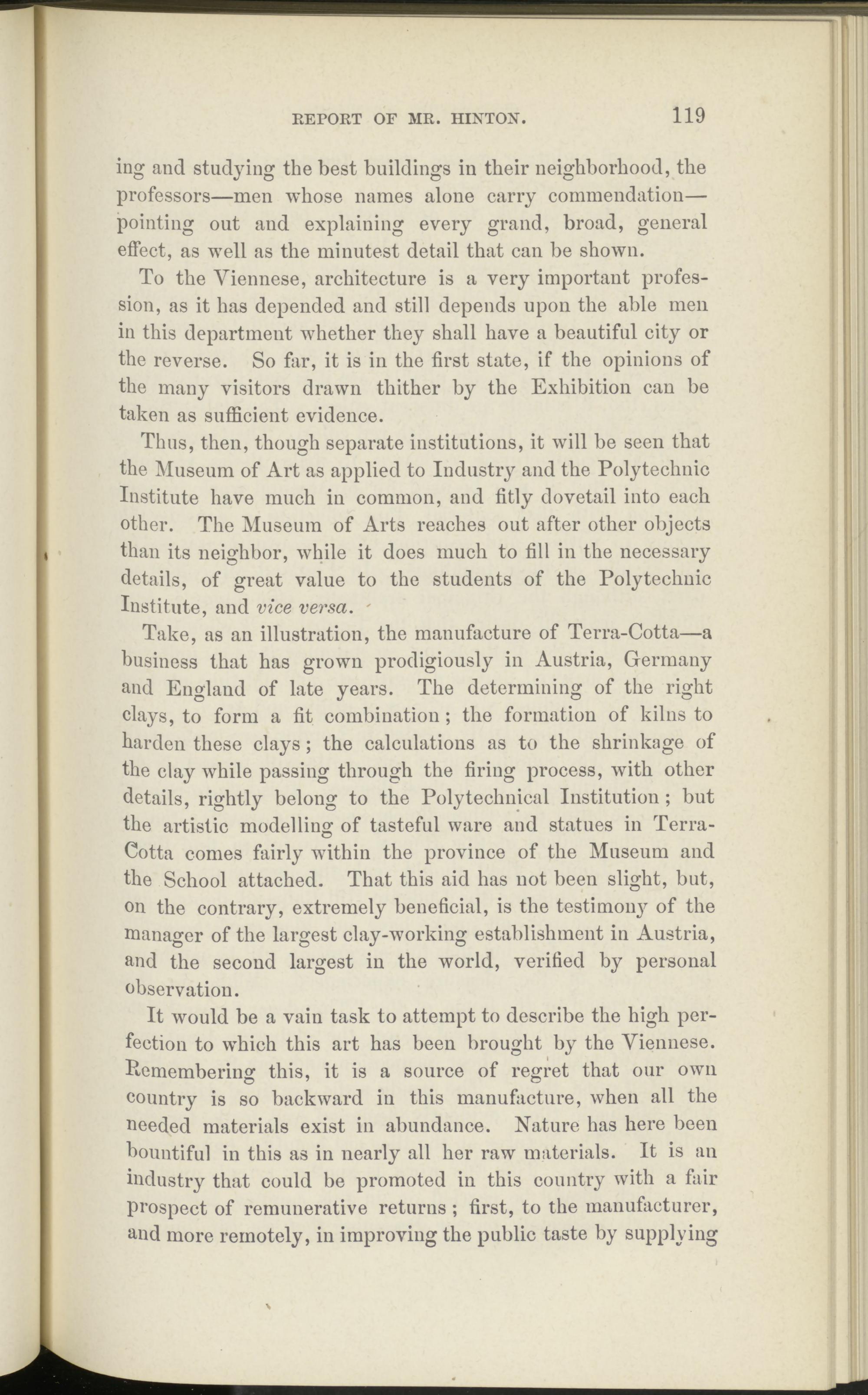 Take, as an illustration, the manufacture of Terra-Cotta—a business that has grown prodigiously in Austria, Germany and England of late years. The determining of the right clays, to form a fit combination; the formation of kilns to harden these clays; the calculations as to the shrinkage of the clay while passing through the firing process, with other details, rightly belong to the Poly technical Institution ; but the artistic modelling of tasteful ware and statues in Terra- Cotta comes fairly within the province of the Museum and the School attached. That this aid has not been slight, but, on the contrary, extremely beneficial, is the testimonj^ of the manager of the largest clay-working establishment in Austria, and the second largest in the world, verified by personal observation.