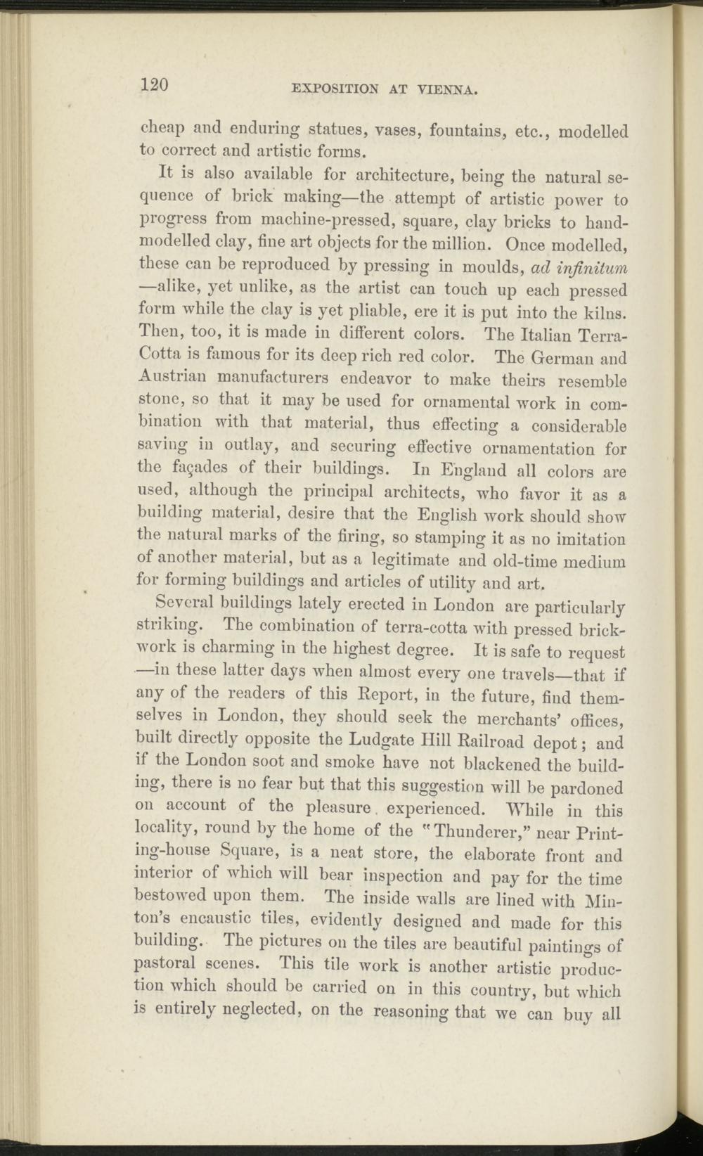 Several buildings lately erected in London are particularly striking. The combination of terra-cotta with pressed brickwork is charming in the highest degree. It is safe to request —iu these latter days when almost every one travels—that if any of the readers of this Report, in the future, find themselves in London, they should seek the merchants’ offices, built directly opposite the Ludgate Hill Railroad depot ; and if the London soot and smoke have not blackened the building, there is no fear but that this suggestion will be pardoned on account of the pleasure. experienced. While in this locality, round by the home of the " Thunderer,” near Printing-house Square, is a neat store, the elaborate front and interior of which will bear inspection and pay for the time bestowed upon them. The inside walls are lined with Minton’s encaustic tiles, evidently designed and made for this building. The pictures on the tiles are beautiful paintings of pastoral scenes. This tile work is another artistic production which should be carried on in this country, but which is entirely neglected, on the reasoning that we can buy all