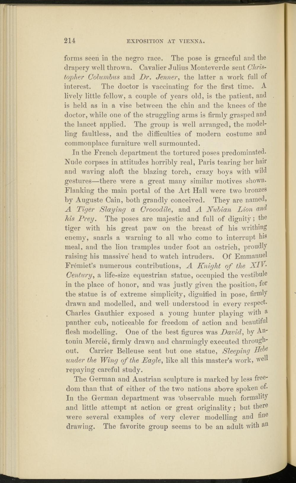 In the French department the tortured poses predominated. Nude corpses in attitudes horribly real, Paris tearing her hair and waving aloft the blazing torch, crazy boys with wild gestures—there were a great many similar motives shown. Flanking the main portal of the Art Hall were two bronzes by Auguste Cain, both grandly conceived. They are named, A Tiger Slaying a Crocodile , and A Nubian Lion and his Prey. The poses are majestic and full of dignity; the tiger with his great paw on the breast of his writhing enemy, snarls a warning to all who come to interrupt his meal, and the lion tramples under foot an ostrich, proudly raising his massive* head to watch intruders. Of Emmanuel Fremiet’s numerous contributions, A Knight of the XlV- Century , a life-size equestrian statue, occupied the vestibule in the place of honor, and was justly given the position, for the statue is of extreme simplicity, dignified in pose, firmly drawn and modelled, and well understood in every respect. Charles Gauthier exposed a young hunter playing with a panther cub, noticeable for freedom of action and beautiful flesh modelling. One of the best figures was David, by Antonin Mercie, firmly drawn and charmingly executed throughout. Carrier Belleuse sent but one statue, Sleeping under the Wing of the Eagle, like all this master’s work, well repaying careful study.
