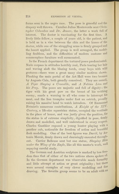 forms seen in the negro race. The pose is graceful and the drapery well thrown. Cavalier Julius Montevercle sent Christopher Columbus and Dr. Jenner, the latter a work full of interest. The doctor is vaccinating for the first time. A lively little fellow, a couple of years old, is the patient, and is held as in a vise between the chin and the knees of the doctor, while one of the struggling arms is firmly grasped and the lancet applied. The group is well arranged, the modelling faultless, and the difficulties of modern costume and commonplace furniture well surmounted.