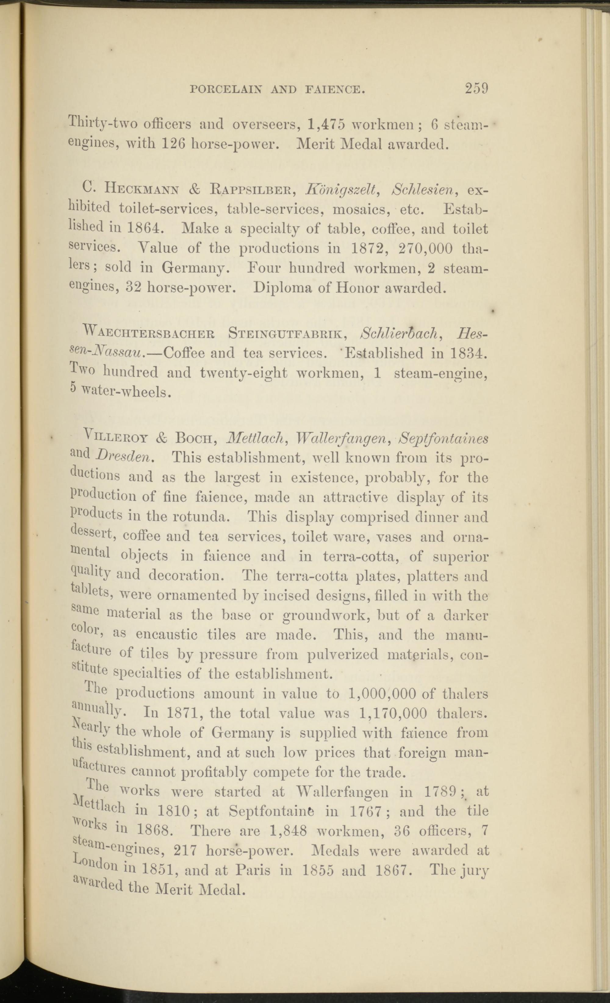Villeroy & Boch, Mettlach, Wallerfangen , Sejptfontaines and Dresden. This establishment, well known from its productions and as the largest in existence, probably, for the production of fine faience, made an attractive display of its Products in the rotunda. This display comprised dinner and dessert, coffee and tea services, toilet ware, vases and ornamental objects in faience and in terra-cotta, of superior duality and decoration. The terra-cotta plates, platters and tablets, were ornamented by incised designs, filled in with the same material as the base or groundwork, but of a darker c °l°r, as encaustic tiles are made. This, and the manufacture of tiles by pressure from pulverized materials, confute specialties of the establishment.