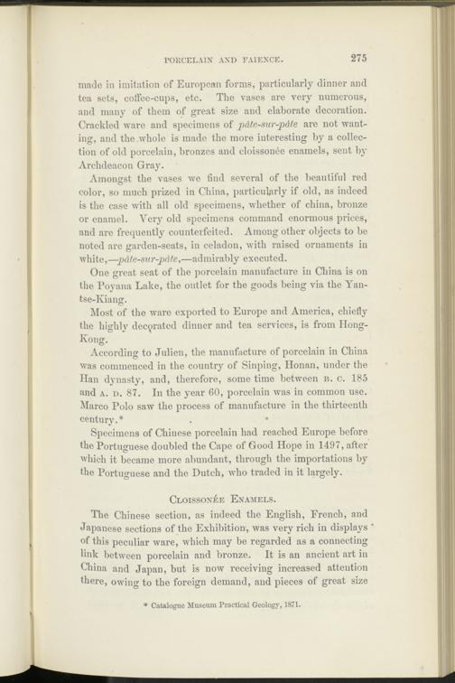 According to Julien, the manufacture of porcelain in China was commenced in the country of Sinping, Honan, under the Han dynasty, and, therefore, some time between b. c. 185 and a. d. 87. In the year 60, porcelain was in common use. Marco Polo saw the process of manufacture in the thirteenth century.* . •