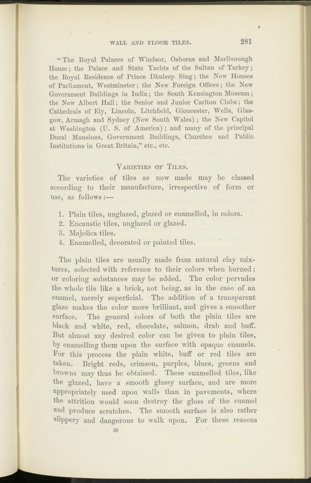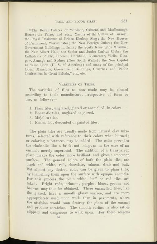 The plain tiles are usually made from natural clay mixtures, selected ivith reference to their colors when burned; or coloring substances may be added. The color pervades the whole tile like a brick, not being, as in the case of an enamel, merely superficial. The addition of a transparent glaze makes the color more brilliant, and gives a smoother surface. The general colors of both the plain tiles are black and white, red, chocolate, salmon, drab and buff. But almost any desired color can be given to plain tiles, by enamelling them upon the surface with opaque enamels. For this process the plain white, buff or red tiles are taken. Bright reds, crimson, purples, blues, greeus and browns may thus be obtained. These enamelled tiles, like the glazed, have a smooth glassy surface, and are more appropriately used upon walls than in pavements, where the attrition would soon destroy the gloss of the enamel and produce scratches. The smooth surface is also rather slippery and dangerous to walk upon. For these reasons