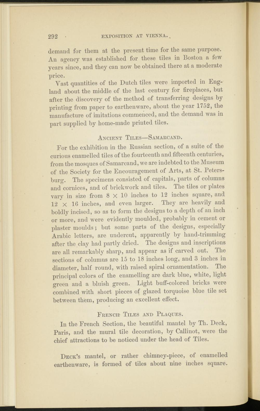 For the exhibition in the Russian section, of a suite of the curious enamelled tiles of the fourteenth and fifteenth centuries, from the mosques of Samarcand, we are indebted to the Museum of the Society for the Encouragement of Arts, at St. Petersburg. The specimens consisted of capitals, parts of columns and cornices, and of brickwork and tiles. The tiles or plates vary in size from 8 X 10 inches to 12 inches square, and 12 X 16 inches, and even larger. They are heavily and boldly incised, so as to form the designs to a depth of an inch or more, and were evidently moulded, probably in cement or plaster moulds; but some parts of the designs, especially Arabic letters, are undercut, apparently by hand-trimming after the clay had partly dried. The designs and inscriptions are all remarkably sharp, and appear as if carved out. The sections of columns are 15 to 18 inches long, and 3 inches in diameter, half round, with raised spiral ornamentation. The principal colors of the enamelling are dark blue, white, light green and a bluish green. Light buff-colored bricks Avere combined with short pieces of glazed torquoise blue tile set between them, producing an excellent effect.