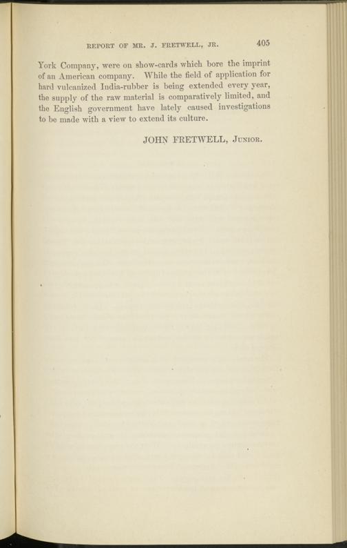 York Company, were on show-cards which bore the imprint of an American company. While the field of application for hard vulcanized India-rubber is being extended every year, the supply of the raw material is comparatively limited, and the English government have lately caused investigations to be made with a view to extend its culture.