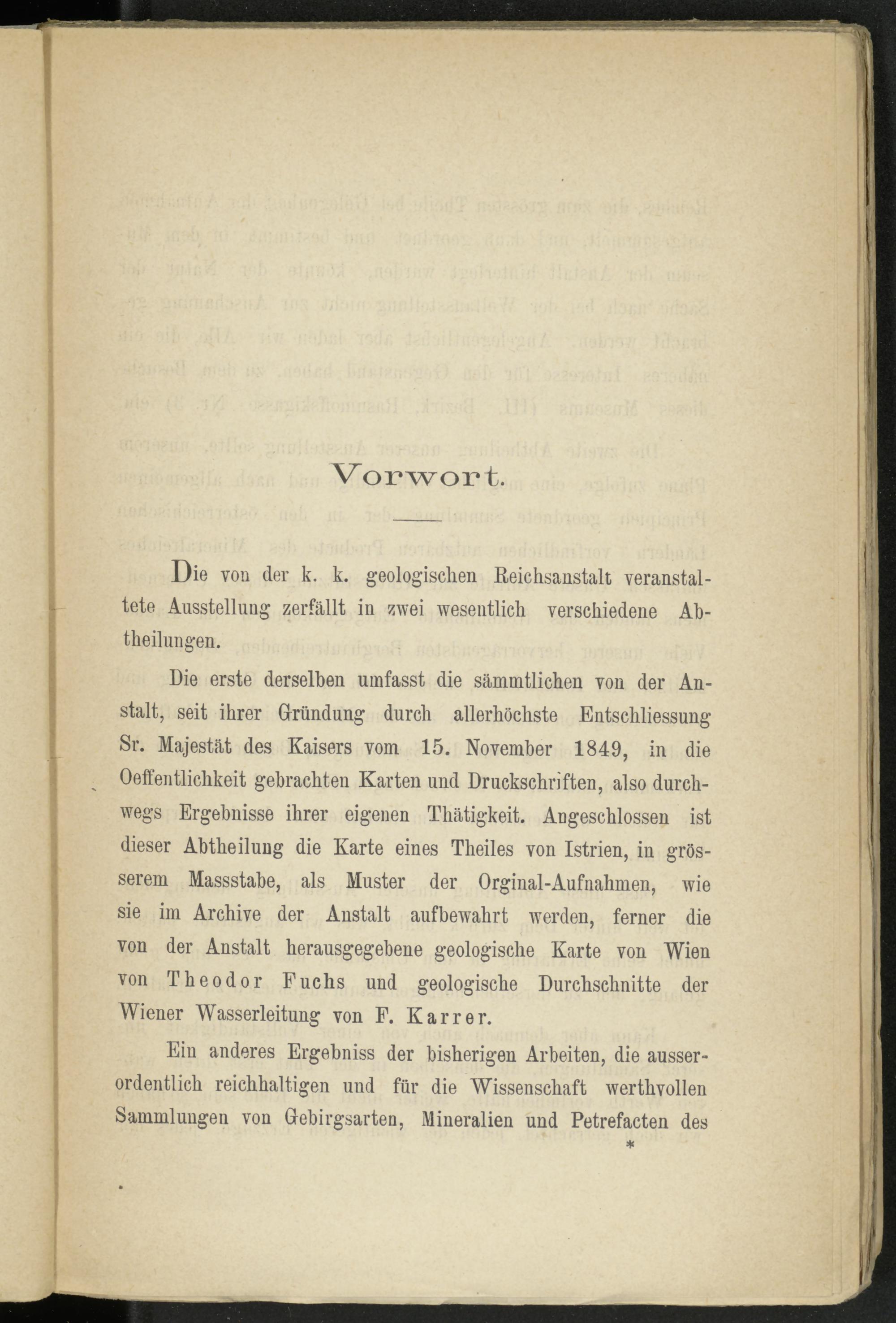 Die erste derselben umfasst die sämmtlichen von der Anstalt, seit ihrer Gründung durch allerhöchste Entschliessung Sr. Majestät des Kaisers vom 15. November 1849, in die Oeffentlichkeit gebrachten Karten und Druckschriften, also durchwegs Ergebnisse ihrer eigenen Thätigkeit. Angeschlossen ist dieser Abtheilung die Karte eines Theiles von Istrien, in grösserem Massstabe, als Muster der Orginal-Aufnahmen, wie sie im Archive der Anstalt aufbewahrt werden, ferner die von der Anstalt herausgegebene geologische Karte von Wien von Theodor Fuchs und geologische Durchschnitte der Wiener Wasserleitung von F. Karrer.