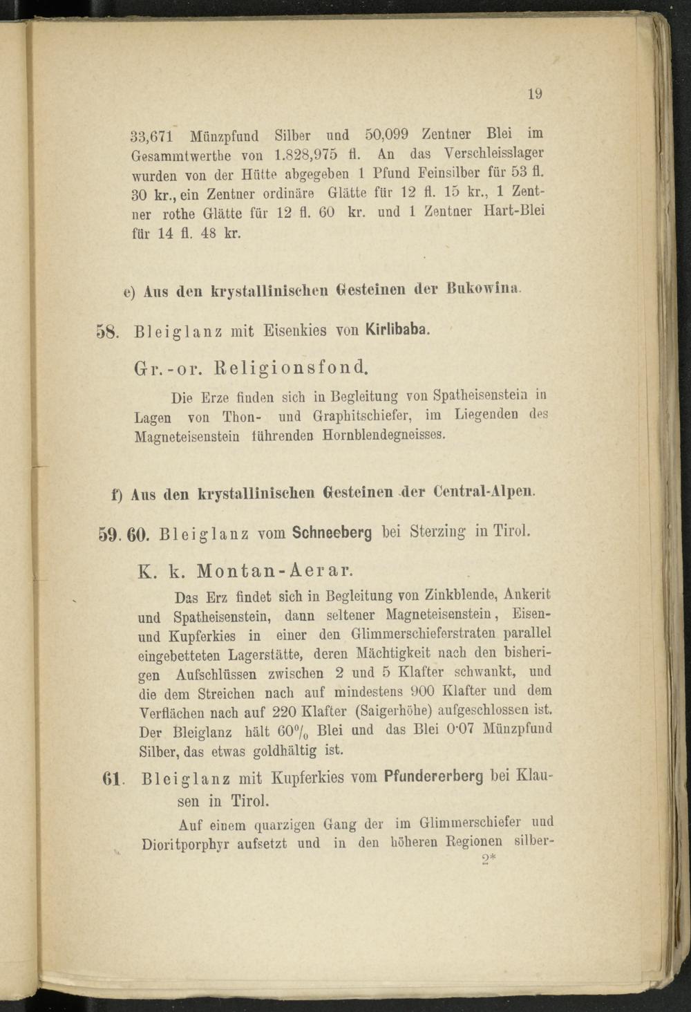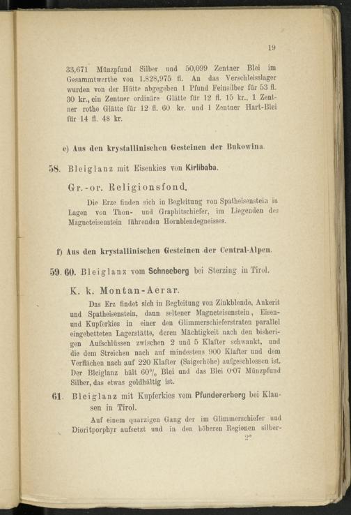 Das Erz findet sich in Begleitung von Zinkblende, Ankerit und Spatheisenstein, dann seltener Magneteisenstein, Eisen- und Kupferkies in einer den Glimmerschieferstraten parallel eingebetteten Lagerstätte, deren Mächtigkeit nach den bisherigen Aufschlüssen zwischen 2 und 5 Klafter schwankt, und die dem Streichen nach auf mindestens 900 Klafter und dem Verflachen nach auf 220 Klafter (Saigerhöhe) aufgeschlossen ist. Der Bleiglanz hält 60°/ 0 Blei und das Blei 0’07 Münzpfund Silber, das etwas goldhaltig ist.