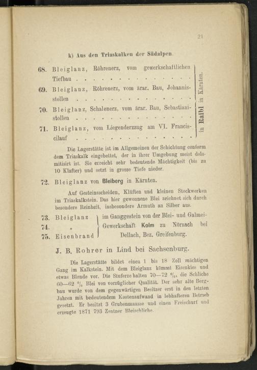 Die Lagerstätte bildet eineu 1 bis 18 Zoll mächtigen Gang im Kalkstein. Mit dem Bleiglanz kömmt Eisenkies und etwas Blende vor. Die Stuferze halten 70—72 °/ 0 , die Schliche 60—62 °/ 0 Blei von vorzüglicher Qualität. Der sehr alte Bergbau wurde von dem gegenwärtigen Besitzer erst in den letzten Jahren mit bedeutendem Kostenaufwand in lebhafteren Betrieb gesetzt. Er besitzt 3 Grubenmaasse und einen Freischurf und erzeugte 1871 793 Zentner Fleischliche.