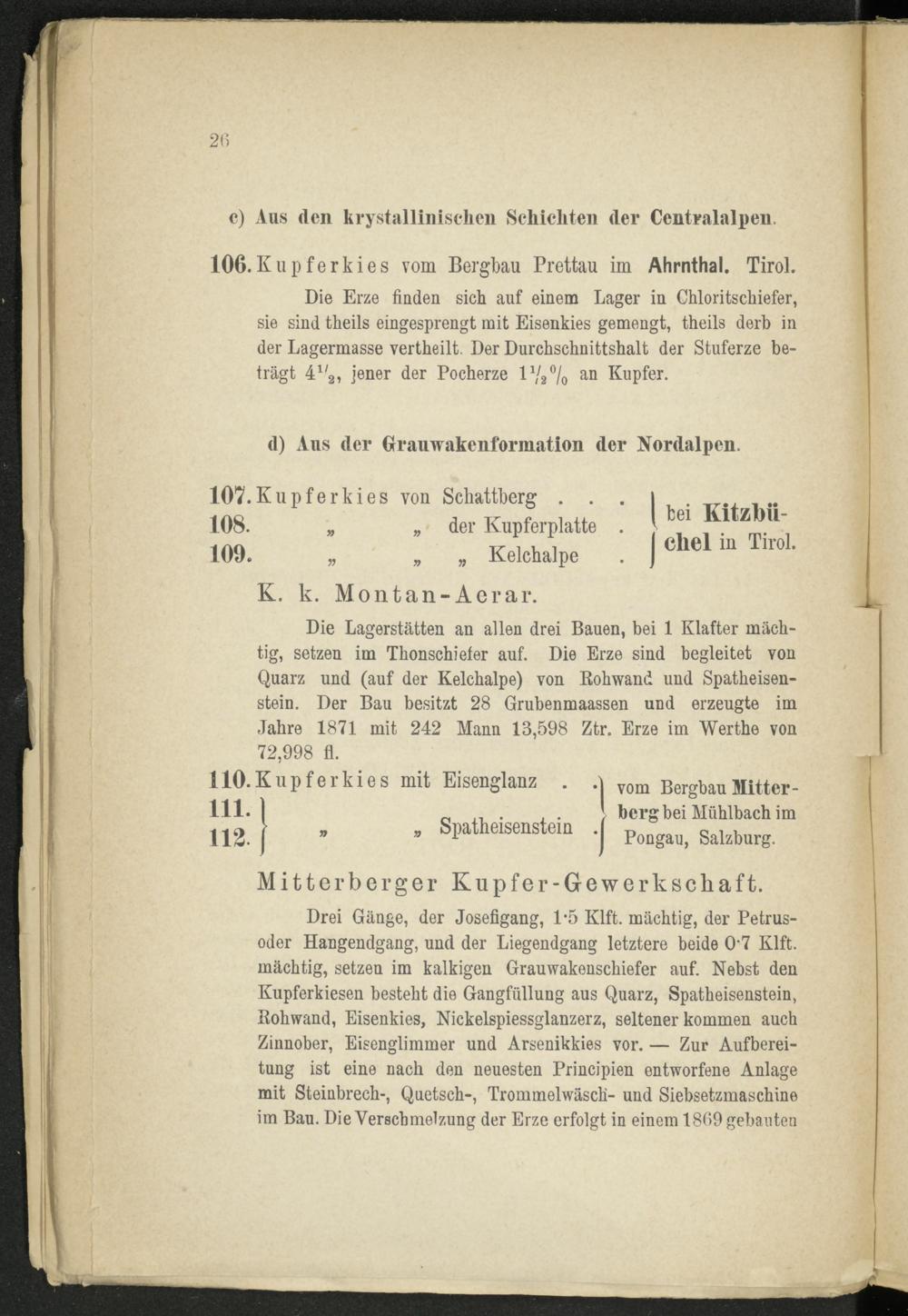 Die Lagerstätten an allen drei Bauen, bei 1 Klafter mächtig, setzen im Thonschiefer auf. Die Erze sind begleitet von Quarz und (auf der Kelchalpe) von Kohwand und Spatheisenstein. Der Bau besitzt 28 Grubenmaassen und erzeugte im Jahre 1871 mit 242 Mann 13,598 Ztr. Erze im Werthe von 72,998 fl.