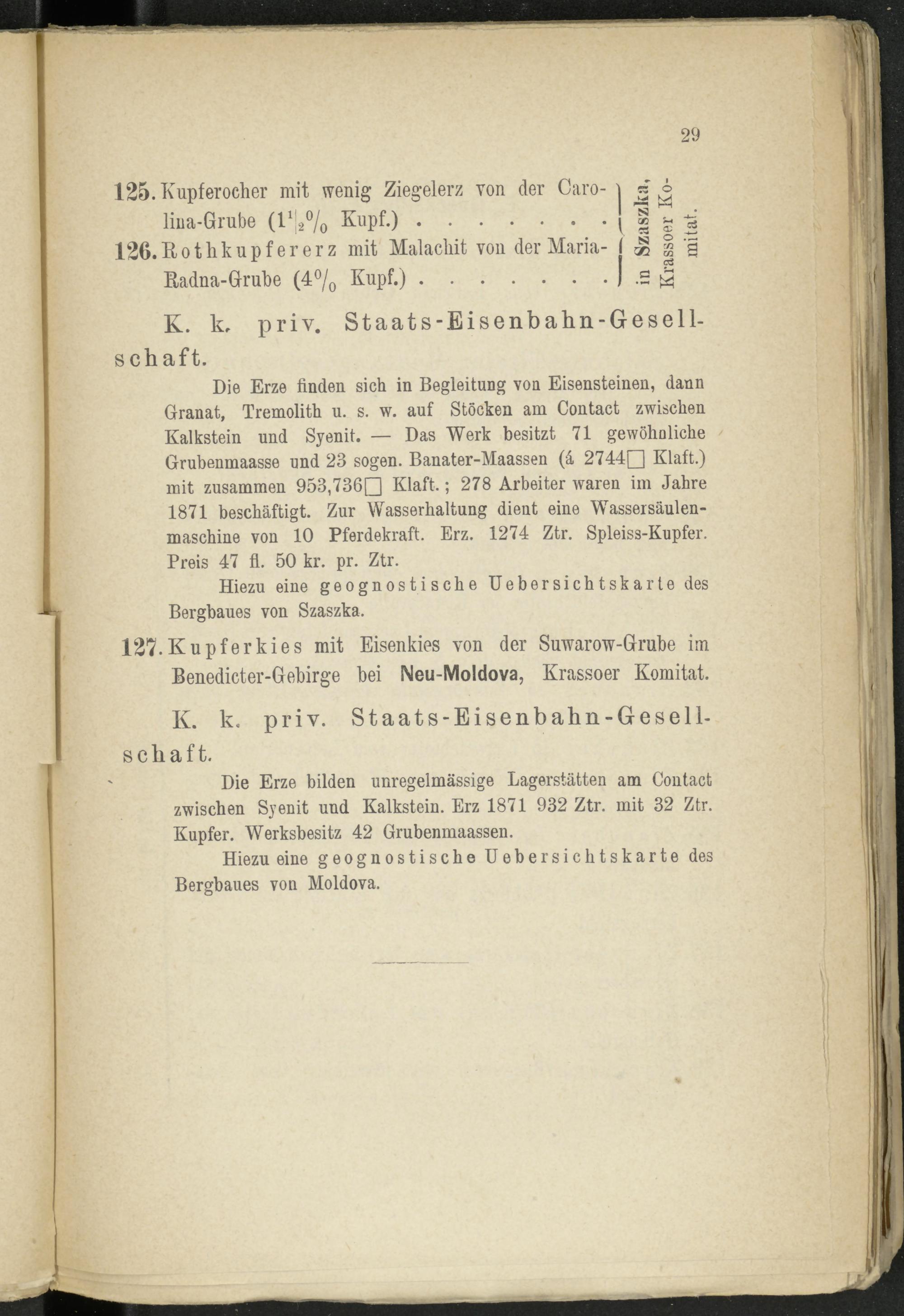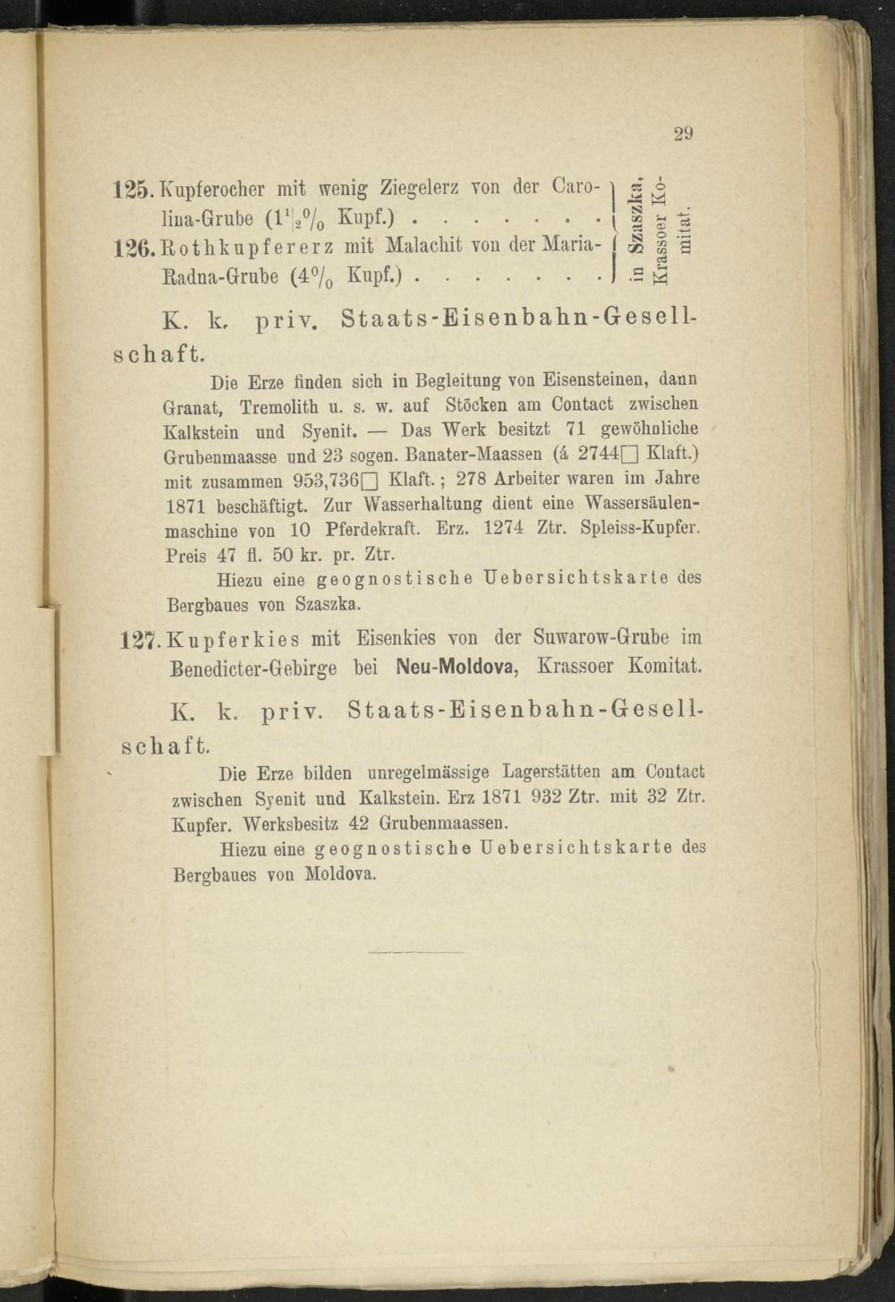 Die Erze finden sich in Begleitung von Eisensteinen, dann Granat, Tremolith u. s. w. auf Stöcken am Contact zwischen Kalkstein und Syenit. — Das Werk besitzt 71 gewöhnliche ' Grubenmaasse und 23 sogen. Banater-Maassen (ä 2744Q Klaft.) mit zusammen 953,736Q Klaft.; 278 Arbeiter waren im Jahre 1871 beschäftigt. Zur Wasserhaltung dieut eine Wassersäulen- maschine von 10 Pferdekraft. Erz. 1274 Ztr. Spleiss-Kupfer. Preis 47 fl. 50 kr. pr. Ztr.