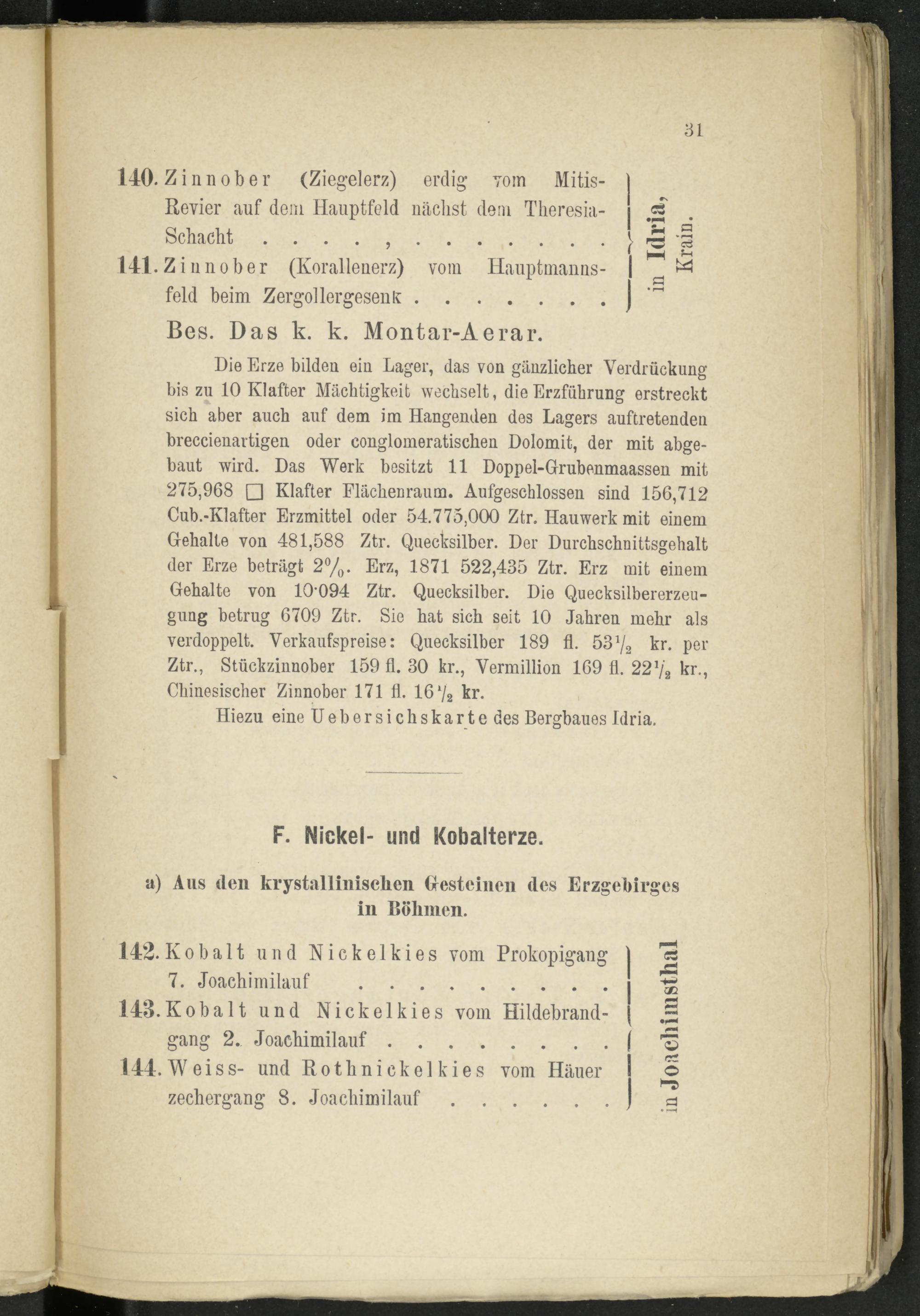 Die Erze bilden ein Lager, das von gänzlicher Verdrückung bis zu 10 Klafter Mächtigkeit wechselt, die Erzführung erstreckt sich aber auch auf dem im Hangenden des Lagers auftretenden breccienartigen oder conglomeratischen Dolomit, der mit abgebaut wird. Das Werk besitzt 11 Doppel-Grubenmaassen mit 275,968 □ Klafter Flächenraum. Aufgeschlossen sind 156,712 Cub.-Klafter Erzmittel oder 54.775,000 Ztr. Hauwerk mit einem Gehalte von 481,588 Ztr. Quecksilber. Der Durchschnittsgehalt der Erze beträgt 2%. Erz, 1871 522,435 Ztr. Erz mit einem Gehalte von 10 - 094 Ztr. Quecksilber. Die Quecksilbererzeugung betrug 6709 Ztr. Sie hat sich seit 10 Jahren mehr als verdoppelt. Verkaufspreise: Quecksilber 189 fl. 53 7 a kr. per Ztr., Stückzinnober 159 fl. 30 kr., Vermillion 169 fl. 227* kr., Chinesischer Zinnober 171 fl. 16 72 kr.