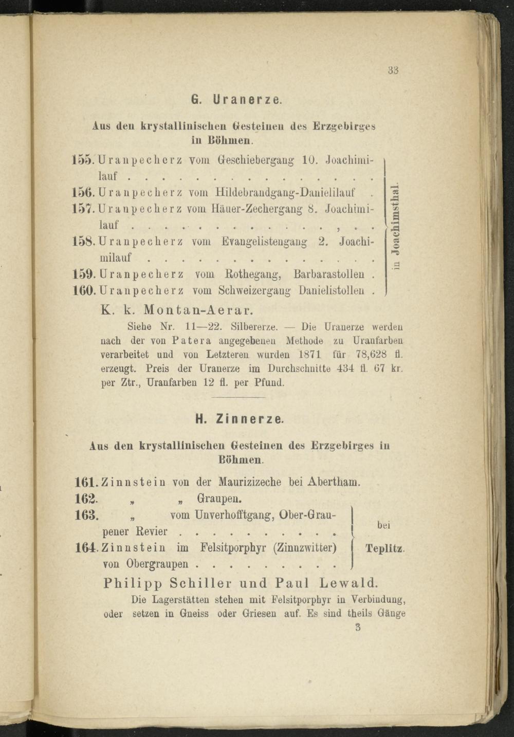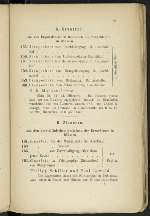 Siehe Nr. 11—22. Silbererze. — Die Uranerze werden nach der von Patera angegebenen Methode zu Uraufarben verarbeitet und von Letzteren wurden 1871 für 78,628 fl. erzeugt. Preis der Uranerze im Durchschnitte 434 fl. 67 kr. per Ztr., Uranfarben 12 fl. per Pfund.