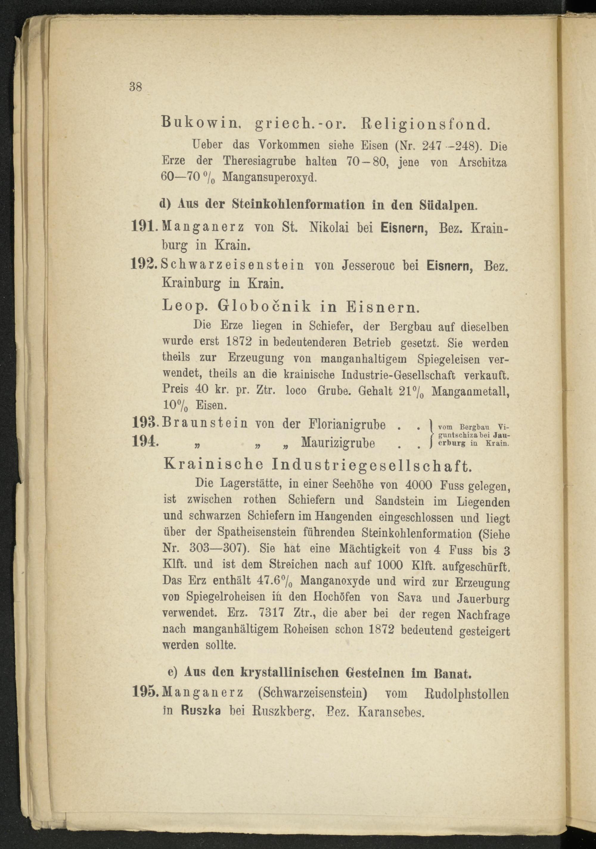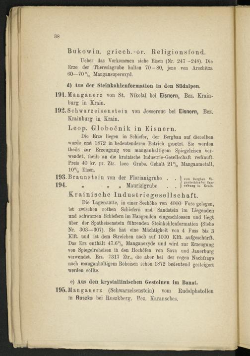 Die Erze liegen in Schiefer, der Bergbau auf dieselben wurde erst 1872 in bedeutenderen Betrieb gesetzt. Sie werden theils zur Erzeugung von manganhaltigein Spiegeleisen verwendet, theils an die krainische Industrie-Gesellschaft verkauft. Preis 40 kr. pr. Ztr. loco Grube. Gehalt 21% Manganmetall, 10% Eisen.