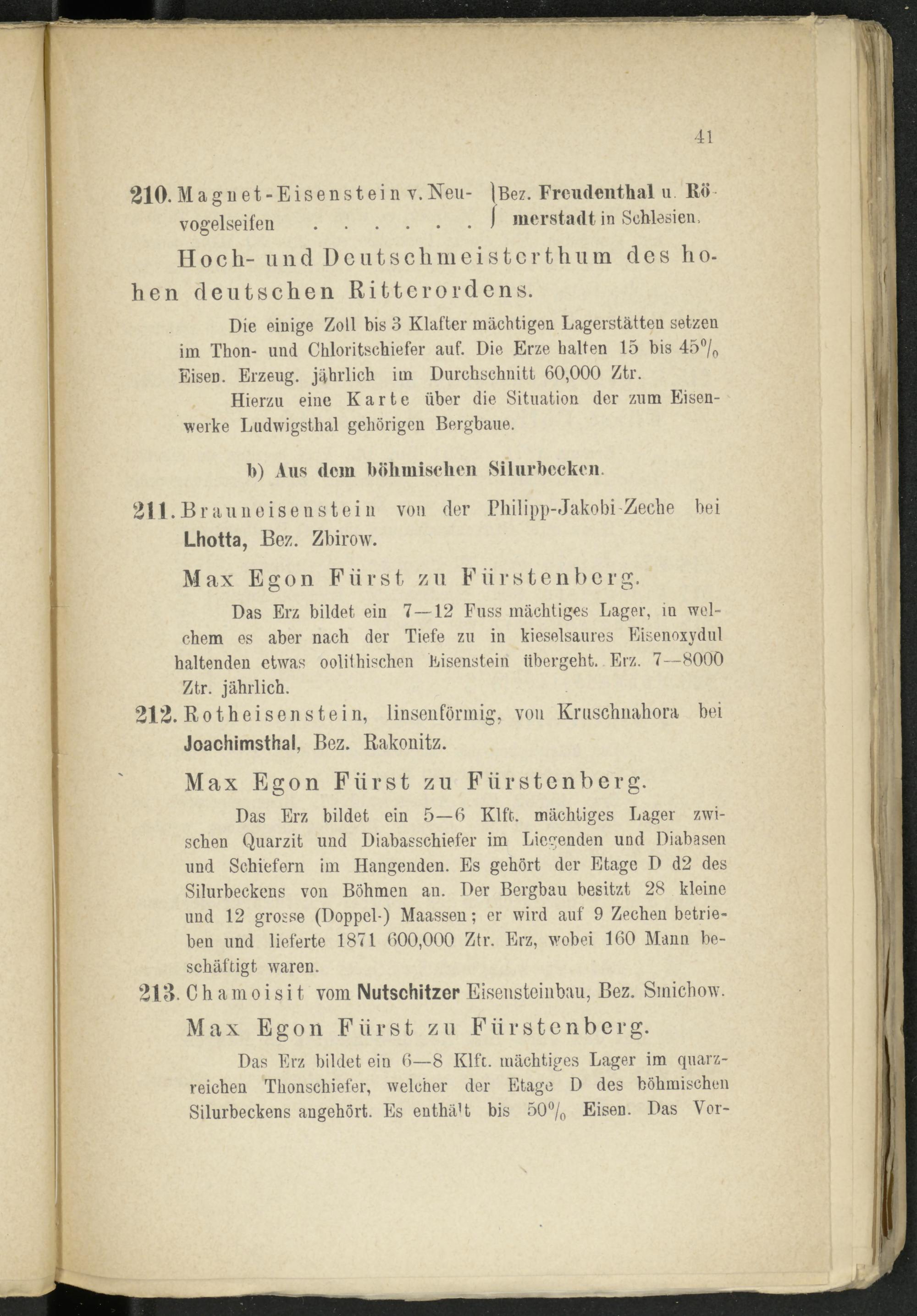 Das Erz bildet ein 6—8 Klft. mächtiges Lager im quarz- reichen Thonschiefer, welcher der Etage D des böhmischen Silurbeckens angehört. Es enthäH bis 50% Eisen. Das Vor-