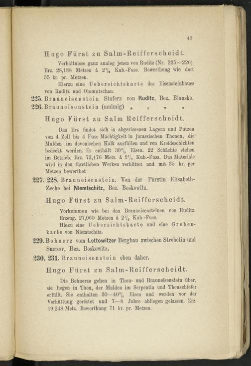 Das Erz findet sich in abgerissenen Lagern und Putzen von 4 Zoll bis 4 Fuss Mächtigkeit in jurassischen Thonen, die Mulden im devonischen Kalk ausfüllen und von Kreideschichten bedeckt werden. Es enthält 30% Eisen. 22 Schächte stehen im Betrieb. Erz. 73,176 Metz, ä 2% Kub.-Fuss. Das Materiale wird in den fürstlichen Werken verhüttet und mit 35 kr. per Metzen bewerthet