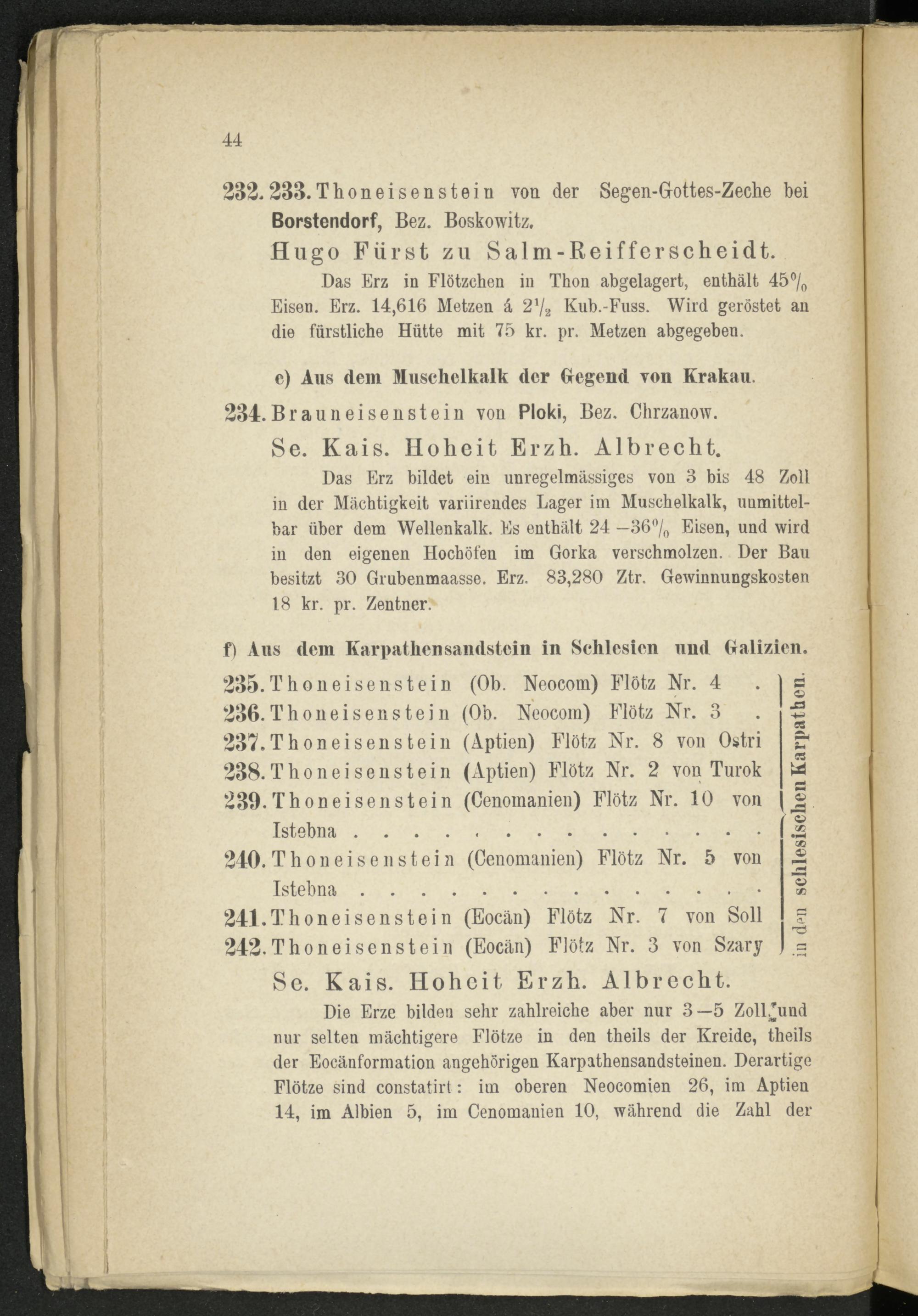 Die Erze bilden sehr zahlreiche aber nur 3—5 Zoll'und nur selten mächtigere Flötze in den theils der Kreide, theils der Eocänformation angehörigen Karpathensandsteinen. Derartige Flötze sind constatirl: im oberen Neocomien 26, im Aptien 14, im Albien 5, im Cenomanien 10, während die Zahl der