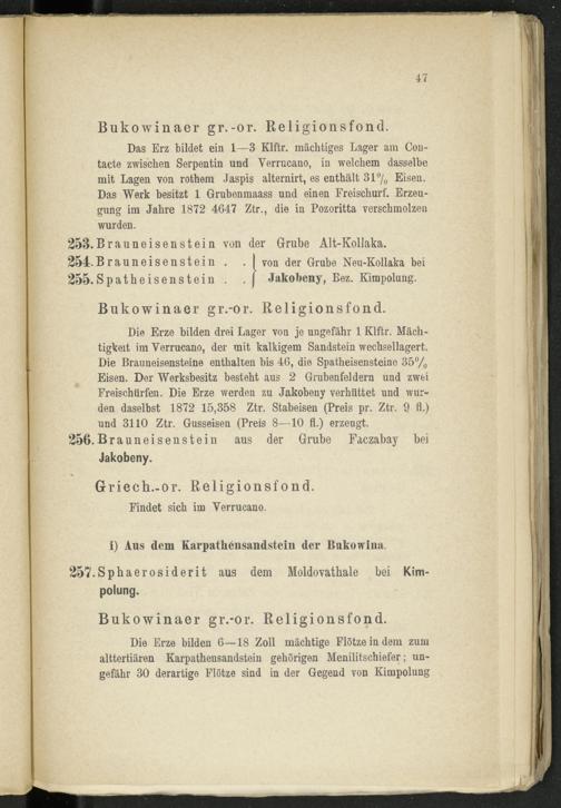 Die Erze bilden 6—18 Zoll mächtige Flötzein dem zum alttertiären Karpathensandstein gehörigen Menilitschiefer; ungefähr 30 derartige Flötze sind in der Gegend von Kimpolung