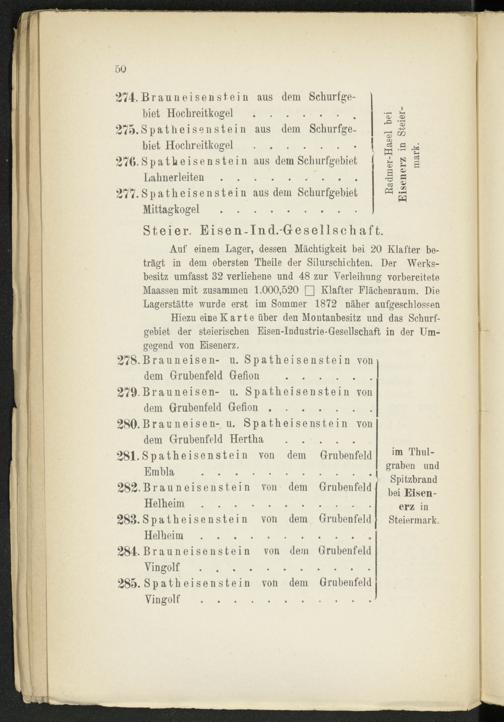 Auf einem Lager, dessen Mächtigkeit bei 20 Eiafter beträgt in dem obersten Theile der Silurschichten. Der Werksbesitz umfasst 32 verliehene und 48 zur Verleihung vorbereitete Maassen mit zusammen 1.000,520 □ Klafter Flächenraum. Die Lagerstätte wurde erst im Sommer 1872 näher aufgeschlossen Hiezu eine K a r t e über den Montanbesitz und das Schurf- gebiet der steierischen Eisen-Industrie-Gesellschaft in der Umgegend von Eisenerz.