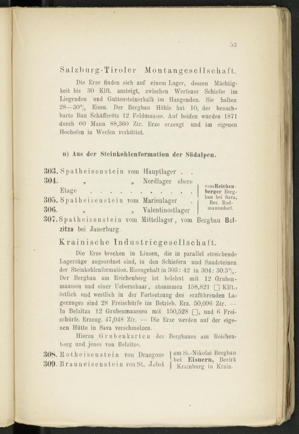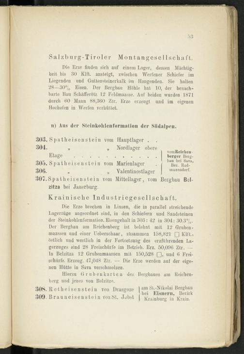 Die Erze brechen in Linsen, die in parallel streichende Lagerzüge angeordnet sind, in den Schiefern und Sandsteinen der SteinkohlenformatioD. Eisengehalt in 303 : 42 in 304: 30.3°/ 0 . Der Bergbau am Reichenberg ist belehnt mit 12 Gruben- maassen und einer Ueberschaar, zusammen 158,821 □Klft., östlich und westlich in der Fortsetzung des erzführenden Lagerzuges sind 28 Freischürfe im Betrieb. Erz. 50,096 Ztr. — ln Belzitza 12 Grubenmaassen mit 150,528 □, und 6 Freischürfe. Erzeug. 47,048 Ztr. — Die Erze werden auf der eigenen Hütte in Sava verschmolzen.