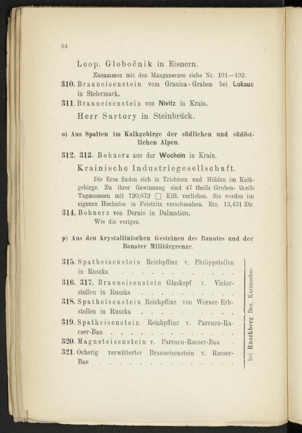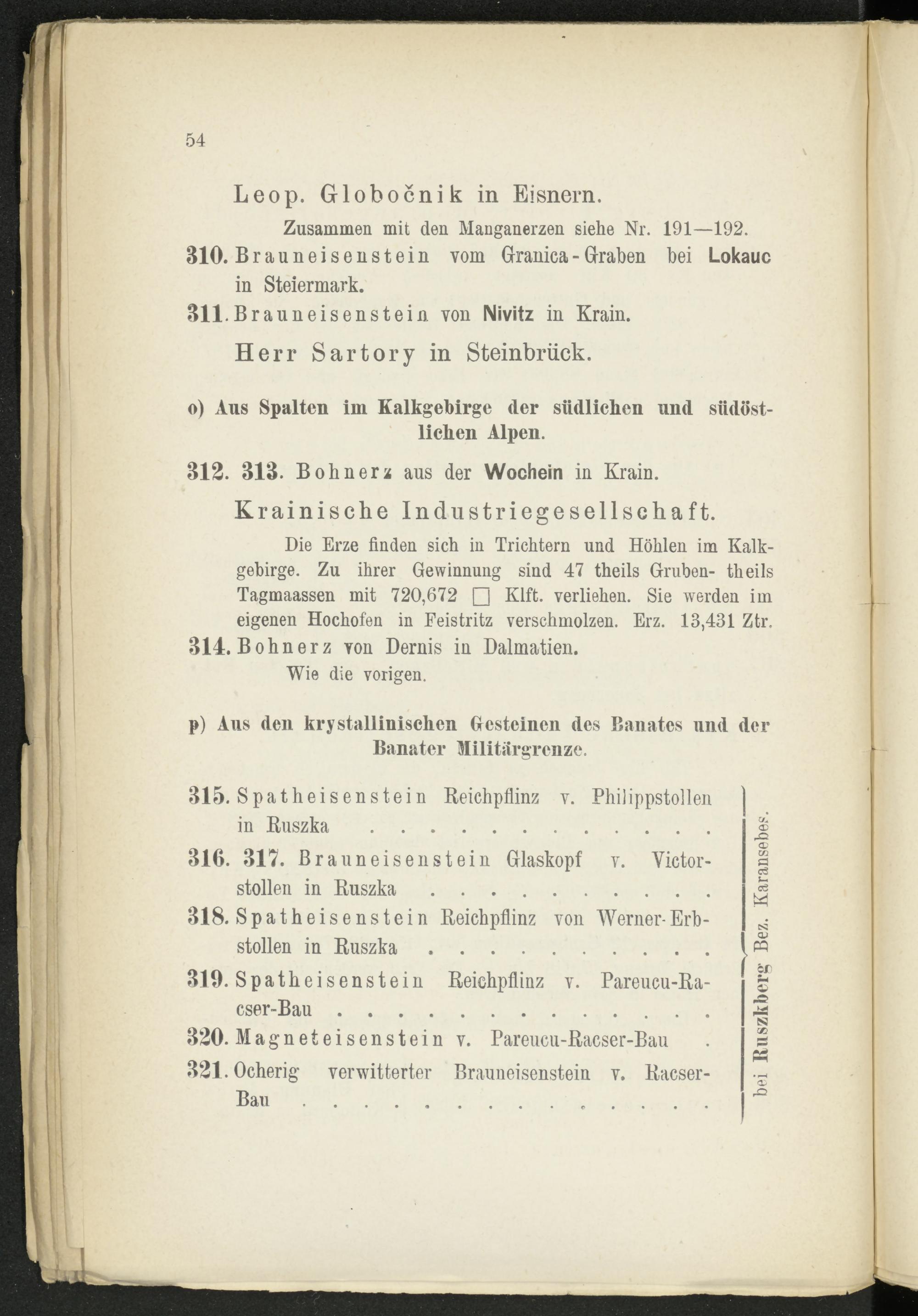 Die Erze finden sich in Trichtern und Höhlen im Kalkgebirge. Zu ihrer Gewinnung sind 47 theils Gruben- theils Tagmaassen mit 720,672 □ Klft. verliehen. Sie werden im eigenen Hochofen in Feistritz verschmolzen. Erz. 13,431 Ztr. 314. Bohnerz Yon Dernis in Dalmatien.