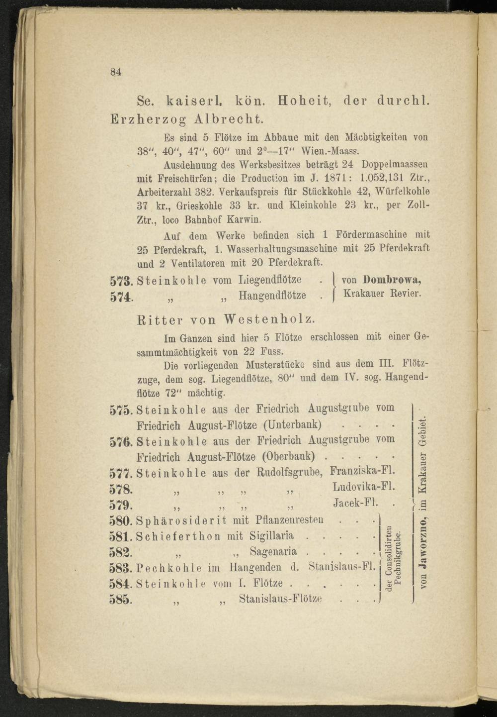Ausdehnung des Werksbesitzes beträgt 24 Doppelmaassen mit Freischürfen; die Production im J. 1871: 1.052,131 Ztr., Arbeiterzahl 382. Verkaufspreis für Stückkohle 42, Würfelkohle 37 kr., Grieskohle 33 kr. und Kleinkohle 23 kr,, per Zoll- Ztr., loco Bahnhof Karwin.