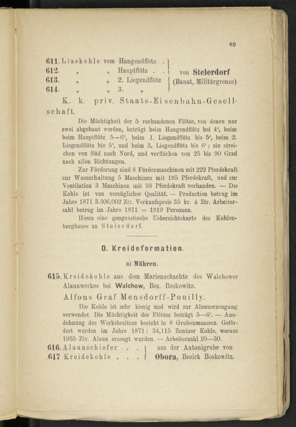 Die Kohle ist sehr kiesig und wird zur Alaunerzeugung verwendet. Die Mächtigkeit des Flötzes beträgt 56'. Aus­dehnung des Werksbesitzes besteht in 8 Grubenmaassen. Geför­dert wurden im Jahre 1871: 34,115 Zentner Kohle, woraus 1955 Ztr. Alaun erzeugt wurden. Arbeiterzahl 2030.