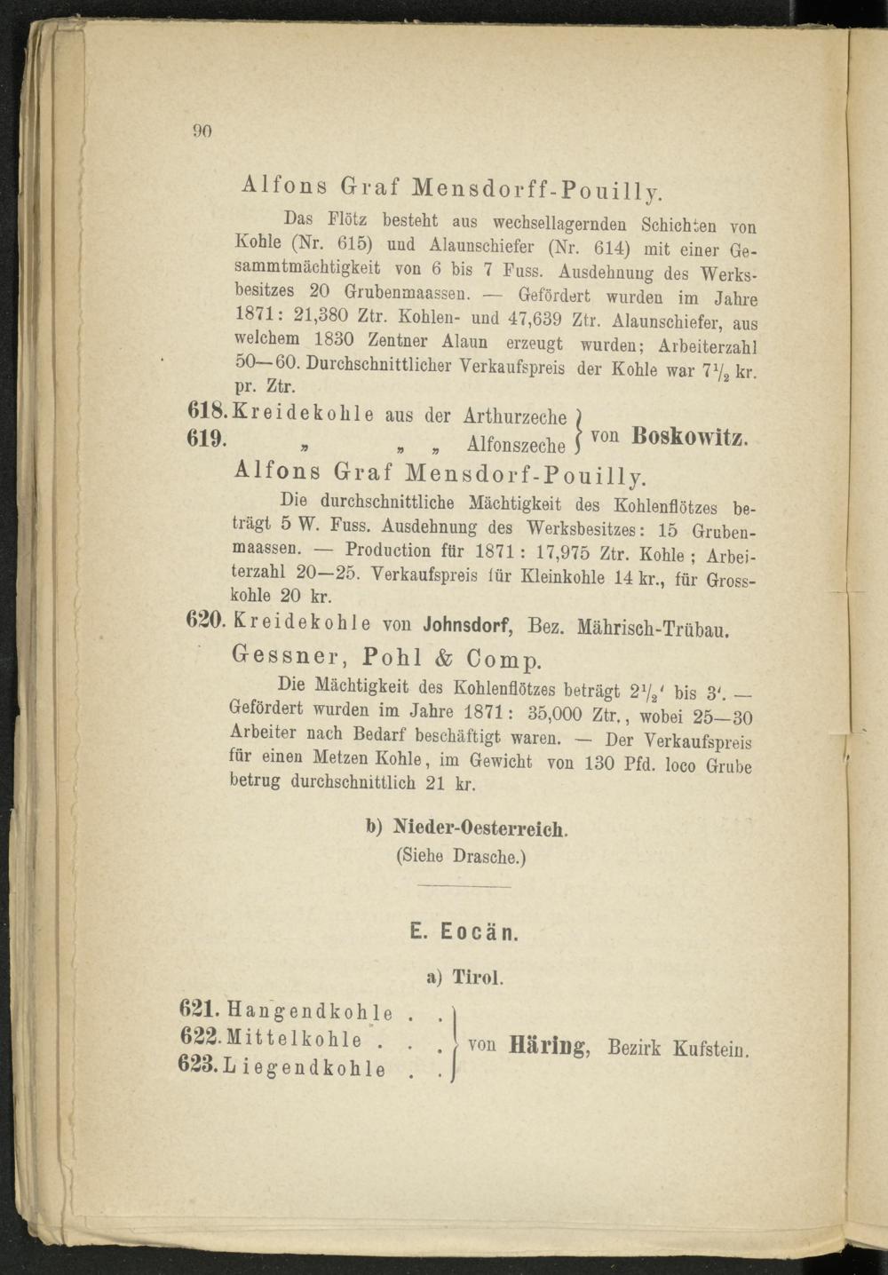 Die durchschnittliche Mächtigkeit des Kohlenflötzes beträgt 5 W. Fuss. Ausdehnung des Werksbesitzes: 15 Gruben- maassen. — Production für 1871: 17,975 Ztr. Kohle; Arbeiterzahl 20—25. Verkaufspreis für Kleinkohle 14 kr., für Grosskohle 20 kr.