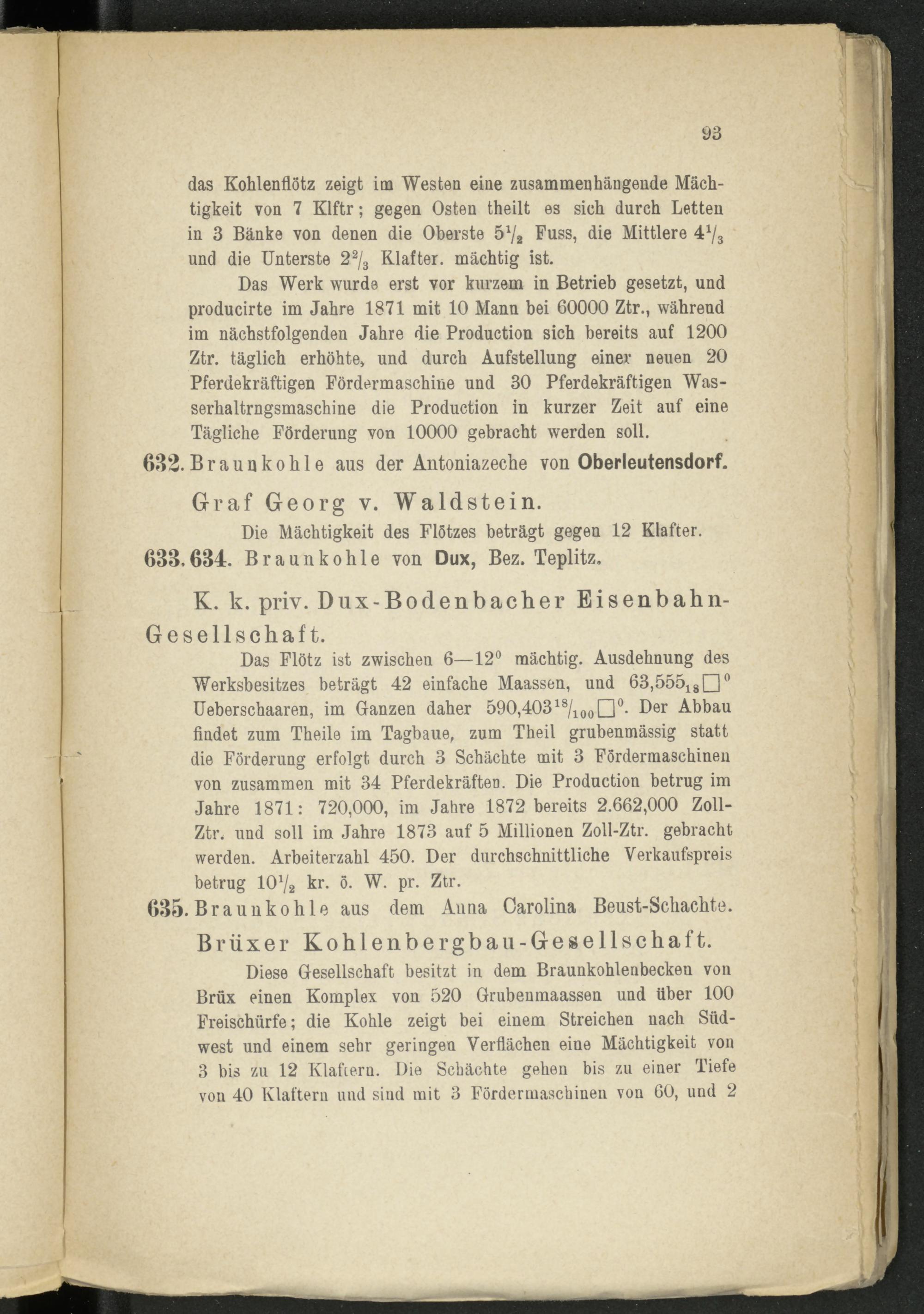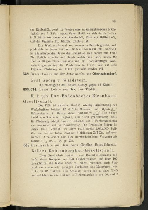 Diese Gesellschaft besitzt in dem Braunkohlenbecken von Brüx einen Komplex von 520 Grubenmaassen und über 100 Freischürfe; die Kohle zeigt bei einem Streichen nach Süd- west und einem sehr geringen Verflachen eine Mächtigkeit von 3 bis zu 12 Klaftern. Die Schächte gehen bis zu einer Tiefe von 40 Klaftern und sind mit 3 Fördermaschinen von 60, und 2