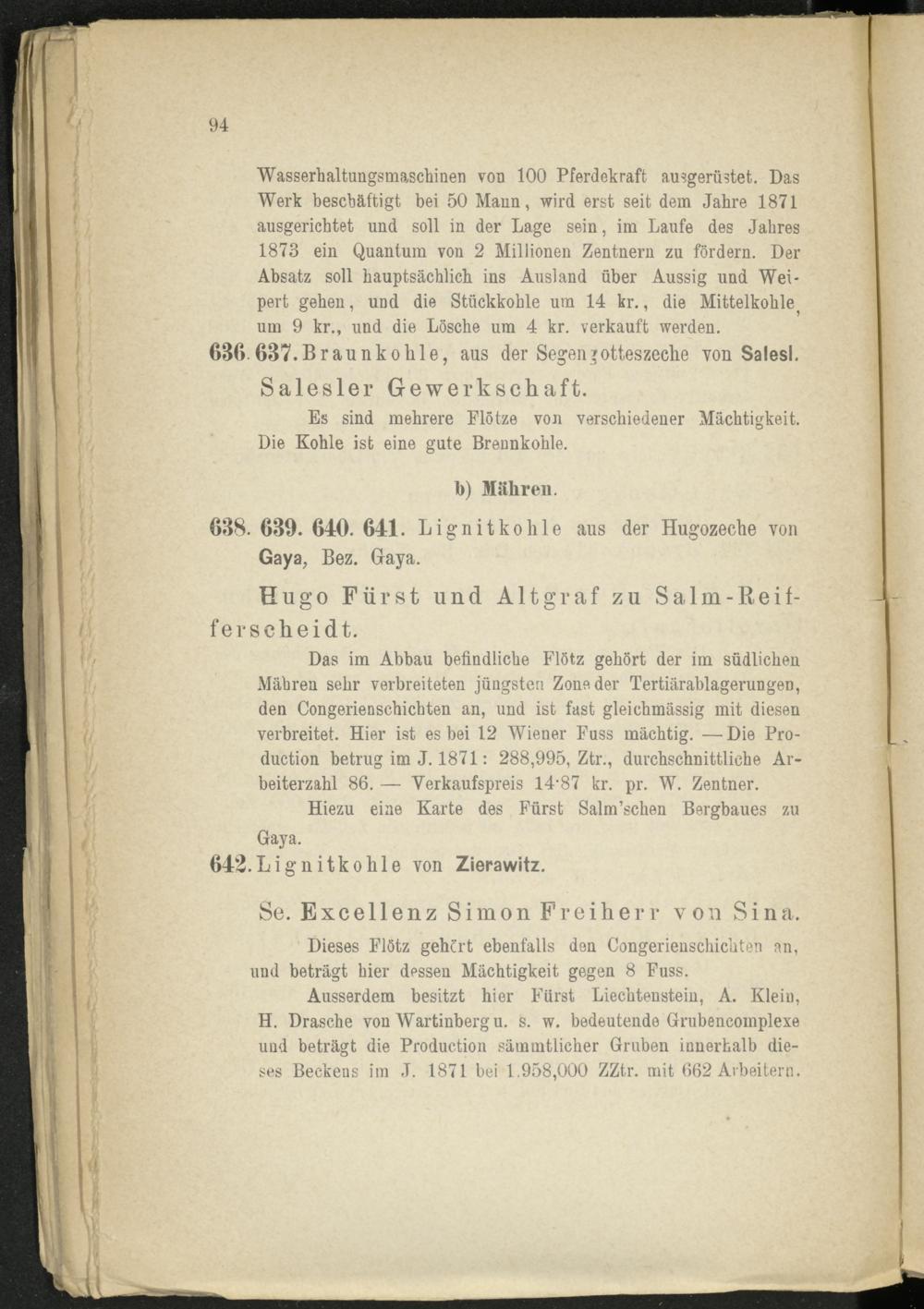 Ausserdem besitzt hier Fürst Liechtenstein, A. Klein, H. Dräsche von Wartinberg u. s. w. bedeutende Grubencoinplexe und beträgt die Production sämmtlicher Gruben innerhalb dieses Beckeus im J. 1871 bei 1.958,000 ZZtr. mit 662 Arbeitern.