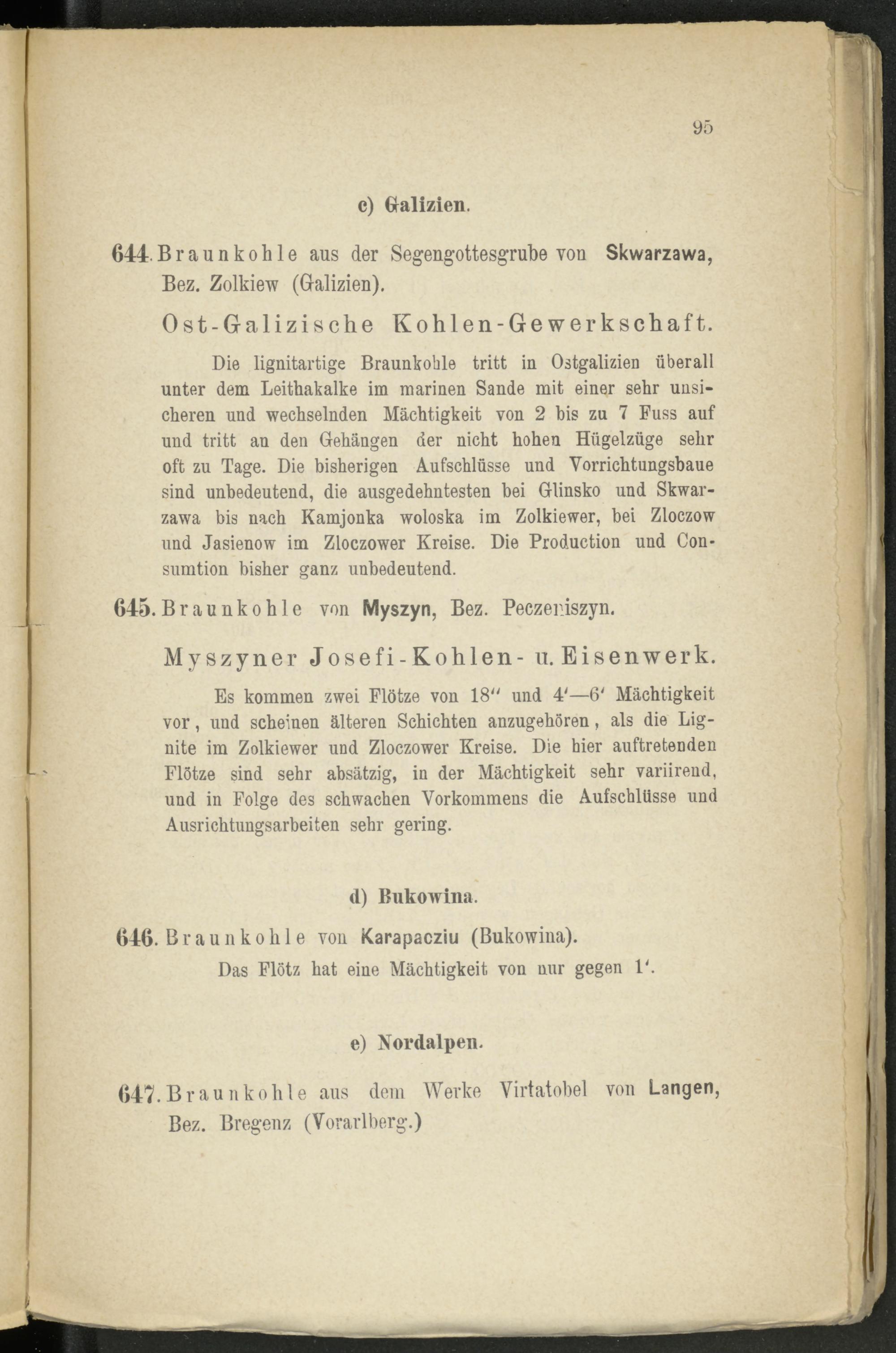 Die lignitartige Braunkohle tritt in Ostgalizien überall unter dem Leithakalke im marinen Sande mit einer sehr unsicheren und wechselnden Mächtigkeit von 2 bis zu 7 Fuss auf und tritt an den Gehängen der nicht hohen Hügelzüge sehr oft zu Tage. Die bisherigen Aufschlüsse und Vorrichtungsbaue sind unbedeutend, die ausgedehntesten bei Glinsko und Skwarzawa bis nach Kamjonka woloska im Zolkiewer, bei Zloczow und Jasienow im Zloczower Kreise. Die Production und Con- sumtion bisher ganz unbedeutend.