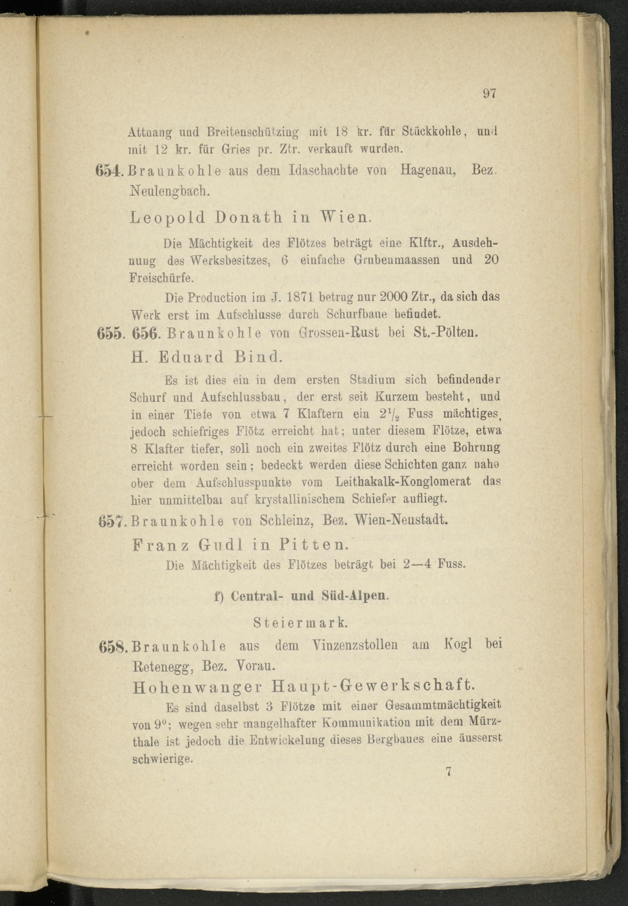 Es ist dies ein in dem ersten Stadium sich befindender Schürf und Aufschlussbau, der erst seit Kurzem besteht, und in einer Tiefe von etwa 7 Klaftern ein 2 x / 2 Fuss mächtiges, jedoch schiefriges Flötz erreicht hat; unter diesem Flötze, etwa 8 Klafter tiefer, soll noch ein zweites Flötz durch eine Bohrung erreicht worden sein; bedeckt werden diese Schichten ganz naho ober dem Aufschlusspunkte vom Leithakalk-Konglomerat, das hier unmittelbai auf krystallinischem Schiefer aufliegt.