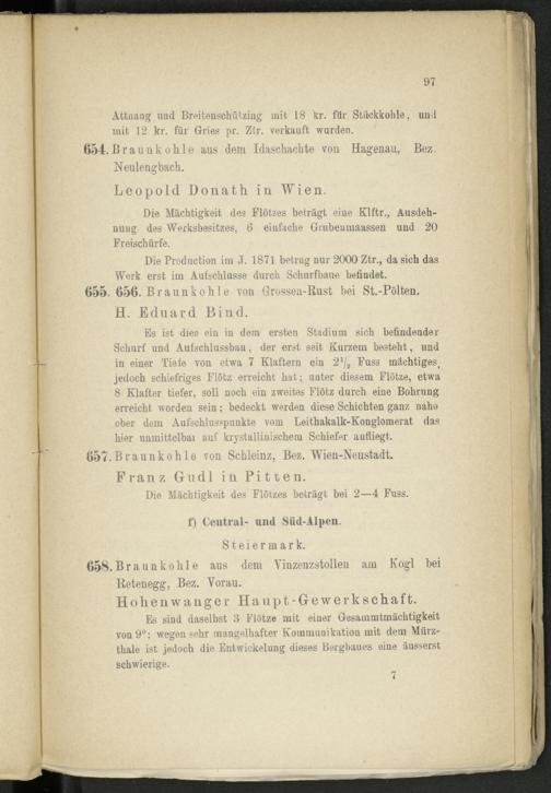 Es sind daselbst 3 Flötze mit einer Gesammtmächtigkeit von 9°; wegen sehr mangelhafter Kommunikation mit dem Mürz- thale ist jedoch die Entwickelung dieses Bergbaues eine äusserst schwierige.