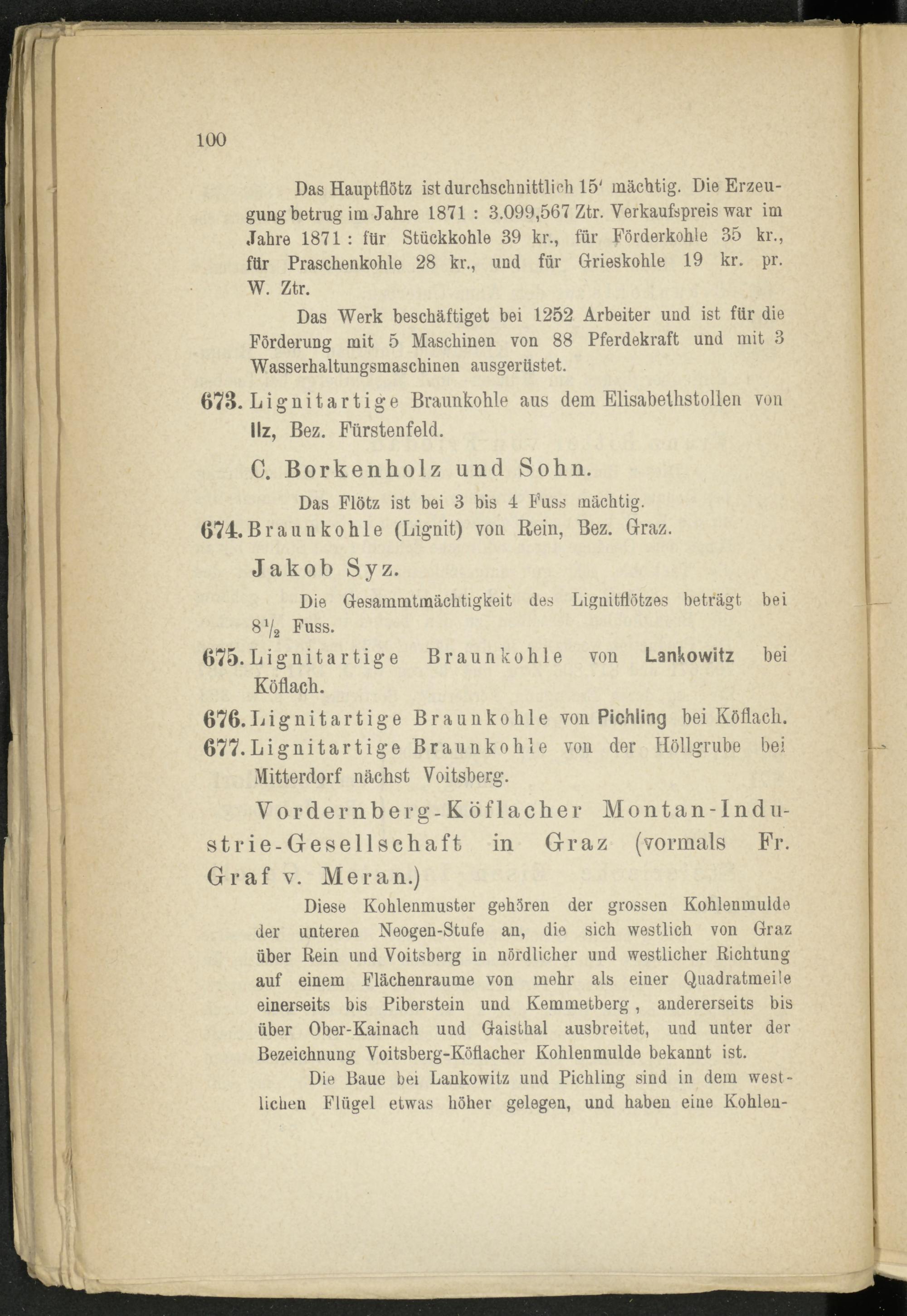 Das Hauptflötz ist durchschnittlich 15' mächtig. Die Erzeugung betrug im Jahre 1871 : 3.099,567 Ztr. Verkaufspreis war im Jahre 1871 : für Stückkohle 39 kr., für Förderkohle 35 kr., für Praschenkohle 28 kr., und für Grieskohle 19 kr. pr. W. Ztr.