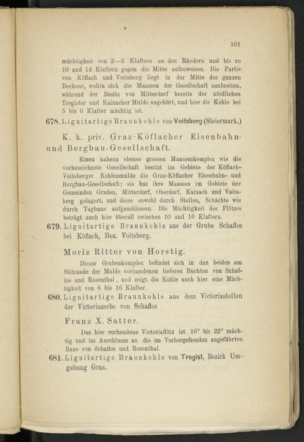 Einen nahezu ebenso grossen Maassenkomplex wie die vorbezeichnete Gesellschaft besitzt im Gebiete der Köflach- Yoitsberger Kohlenmulde die Graz-Köflacher Eisenbahn- und Bergbau-Gesellschaft; sie hat ihre Maassen im Gebiete der Gemeinden Graden, Mitterdorf, Oberdorf, Kainacb und Yoitsberg gelagert, und diese sowohl durch Stollen, Schächte wie durch Tagbaue aufgeschlossen. Die Mächtigkeit des Flötzes beträgt auch hier überall zwischen 10 und 16 Klaftern.