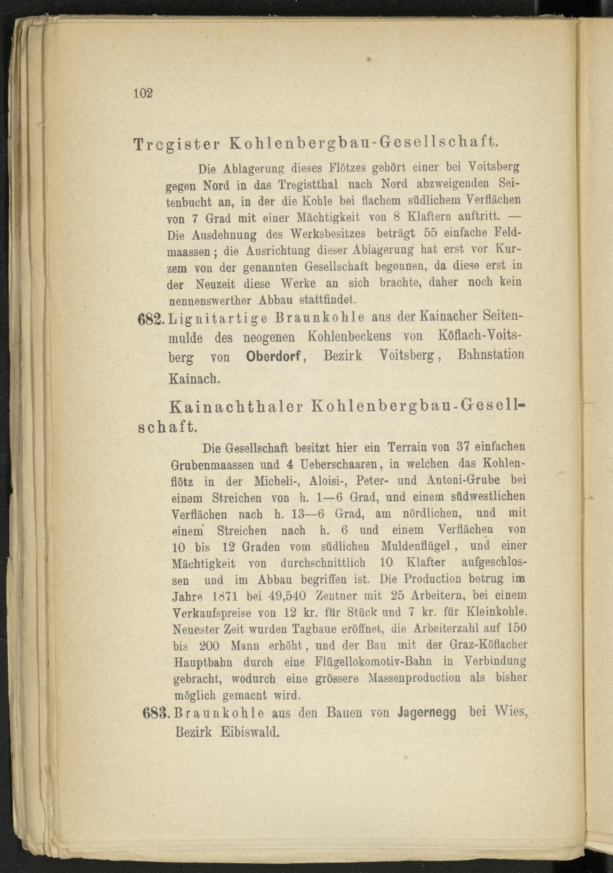 Die Gesellschaft besitzt hier ein Terrain von 37 einfachen Grubenmaassen und 4 Ueberschaaren, in welchen das Kohlen- flötz in der Micheli-, Aloisi-, Peter- und Antoni-Grube bei einem Streichen von h. 1—6 Grad, und einem südwestlichen Verflachen nach h. 13—6 Grad, am nördlichen, und mit einem Streichen nach h. 6 und einem Verflachen von 10 bis 12 Graden vom südlichen Muldenflügel , und einer Mächtigkeit von durchschnittlich 10 Klafter aufgeschlossen und im Abbau begriffen ist. Die Production betrug im Jahre 1871 bei 49,540 Zentner mit 25 Arbeitern, bei einem Verkaufspreise von 12 kr. für Stück und 7 kr. für Kleinkohle. Neuester Zeit wurden Tagbaue eröffnet, die Arbeiterzahl auf 150 bis 200 Mann erhöht, und der Bau mit der Graz-Köflacher Hauptbahn durch eine Flügellokomotiv-Bahn in Verbindung gebracht, wodurch eine grössere Massenproduction als bisher möglich gemacnt wird.