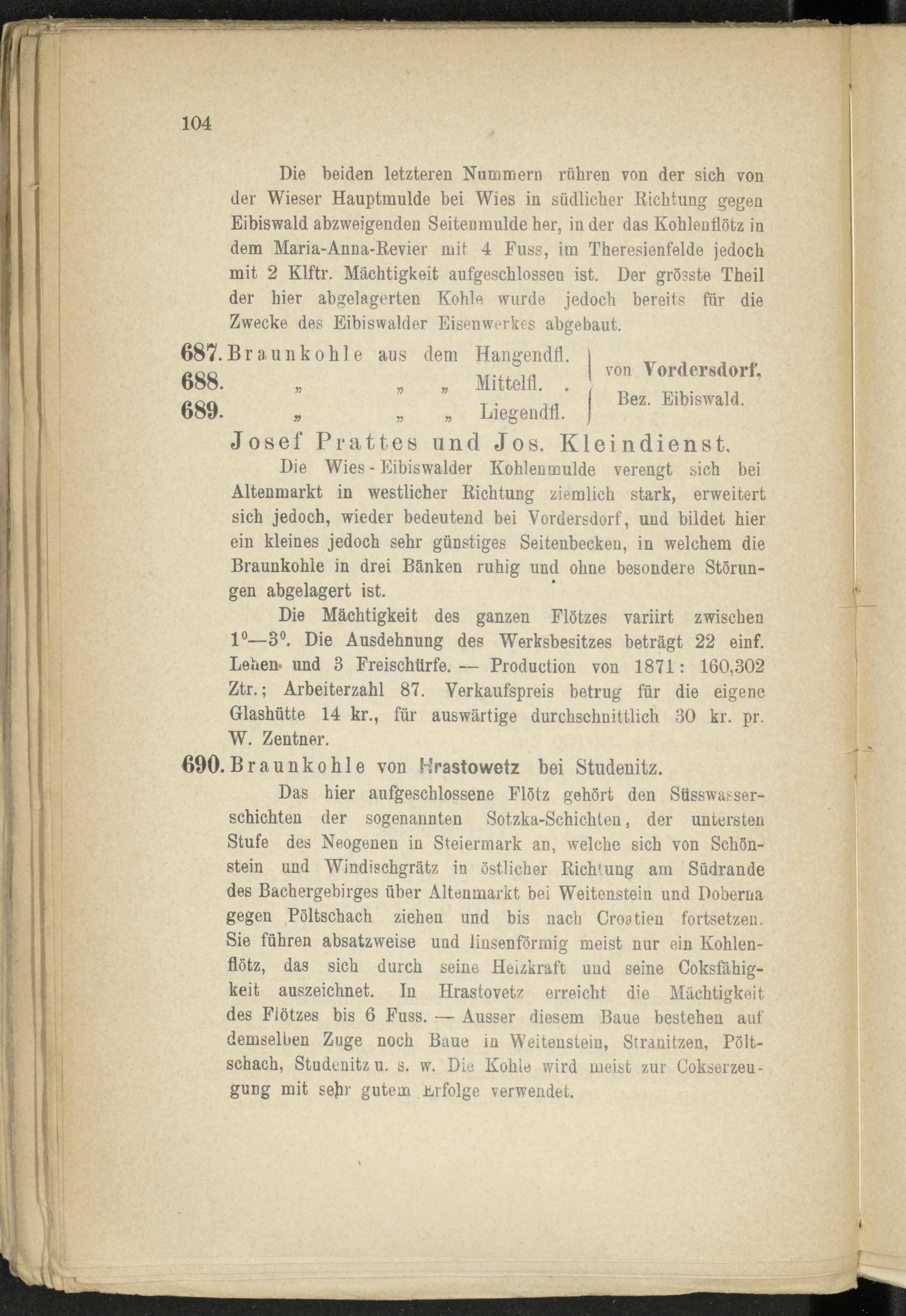 Die Mächtigkeit des ganzen Flötzes variirt zwischen 1°—3°. Die Ausdehnung des Werksbesitzes beträgt 22 einf. Lehen- und 3 Freischürfe.— Production von 1871: 160,302 Ztr.; Arbeiterzahl 87. Verkaufspreis betrug für die eigene Glashütte 14 kr., für auswärtige durchschnittlich 30 kr. pr. W. Zentner.