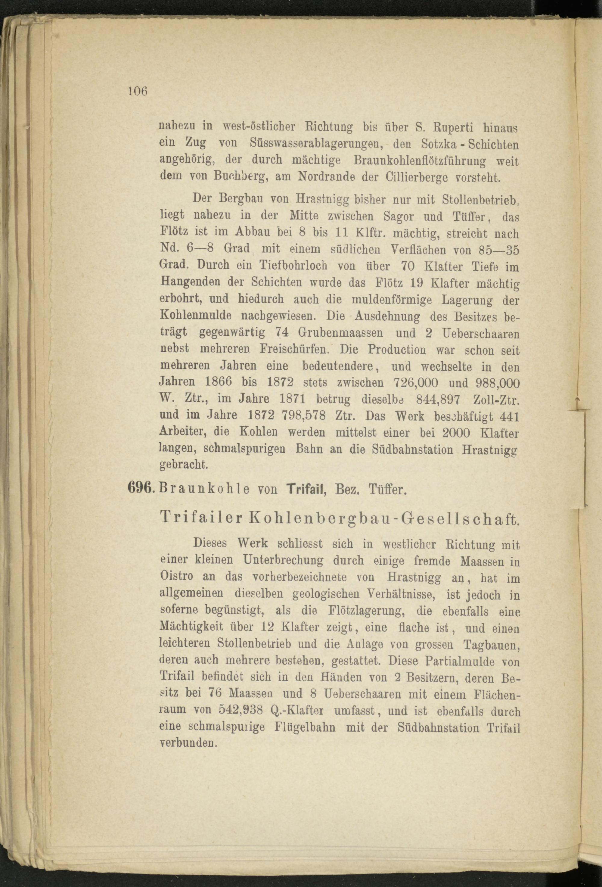 Der Bergbau von Hrastnigg bisher nur mit Stollenbetrieb, liegt nahezu in der Mitte zwischen Sagor und Ttiffer, das Flötz ist im Abbau bei 8 bis 11 Klftr. mächtig, streicht nach Nd. 6—8 Grad, mit einem südlichen Verflächen von 85—35 Grad. Durch ein Tiefbohrloch von über 70 Klatter Tiefe im Hangenden der Schichten wurde das Flötz 19 Klafter mächtig erbohrt, und hiedurch auch die muldenförmige Lagerung der Kohlenmulde nach gewiesen. Die Ausdehnung des Besitzes beträgt gegenwärtig 74 Grubenmaassen und 2 Ueberschaaren nebst mehreren Freischürfen. Die Production war schon seit mehreren Jahren eine bedeutendere, und wechselte in den Jahren 1866 bis 1872 stets zwischen 726,000 und 988,000 W. Ztr., im Jahre 1871 betrug dieselbe 844,897 Zoll-Ztr. und im Jahre 1872 798,578 Ztr. Das Werk beschäftigt 441 Arbeiter, die Kohlen werden mittelst einer bei 2000 Klafter langen, schmalspurigen Bahn an die Südbabnstation Hrastnigg gebracht.