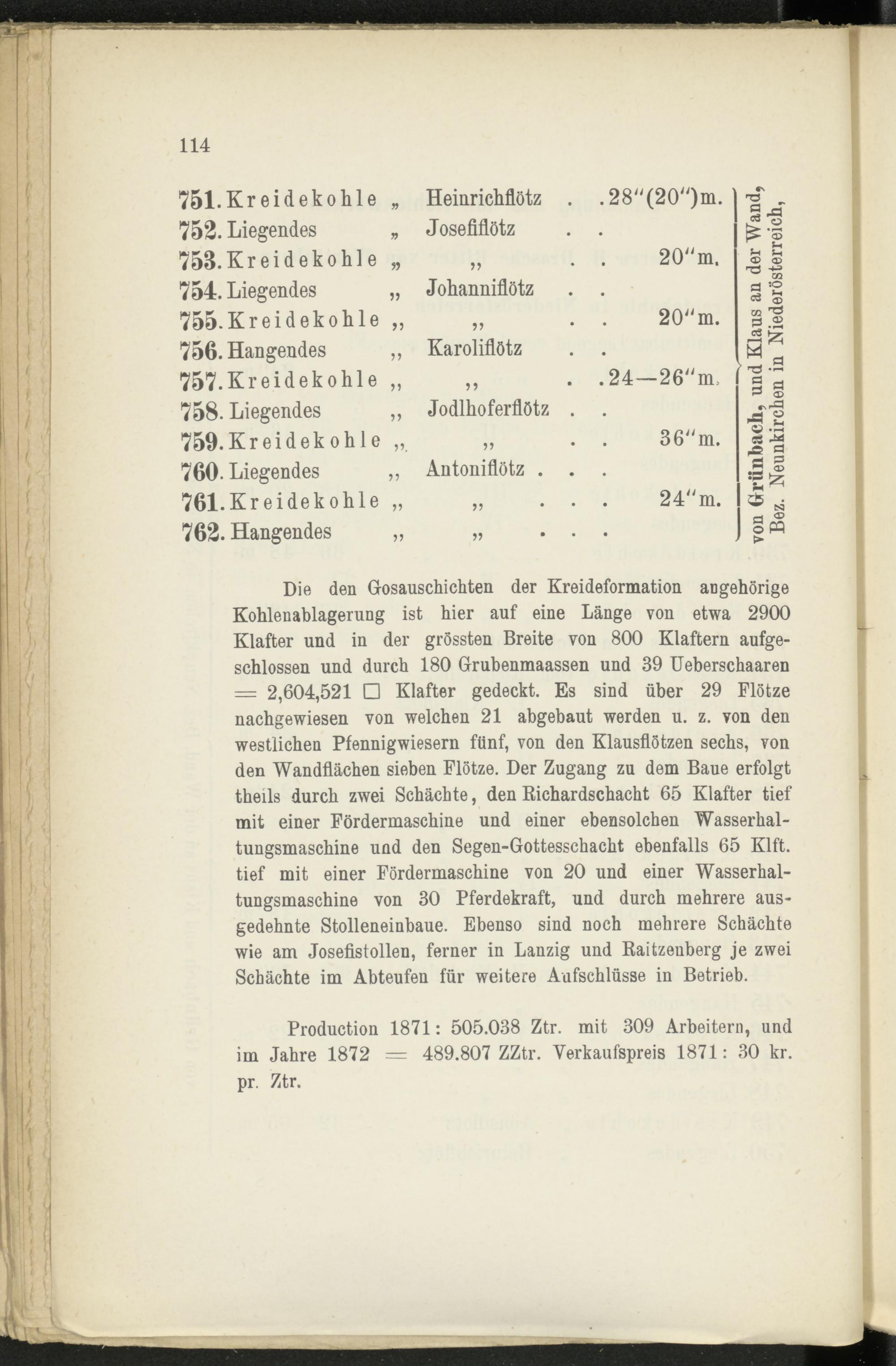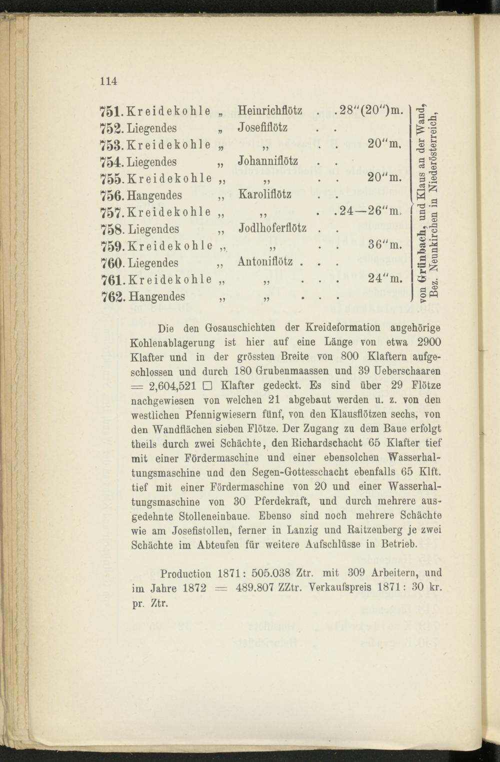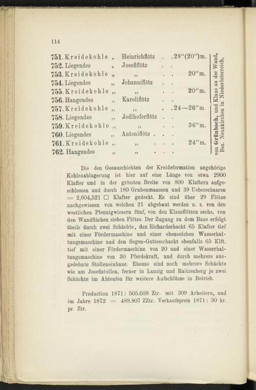 Die den Gosauschichten der Kreideformation angehörige Kohlenablagerang ist hier auf eine Länge von etwa 2900 Klafter und in der grössten Breite von 800 Klaftern aufgeschlossen und durch 180 Grubenmaassen und 39 Ueberschaaren = 2,604,521 □ Klafter gedeckt. Es sind über 29 Flötze nachgewiesen von welchen 21 abgebaut werden u. z. von den westlichen Pfennigwiesern fünf, von den Klausflötzen sechs, von den Wandflächen sieben Flötze. Der Zugang zu dem Baue erfolgt theils durch zwei Schächte, den Richardschacht 65 Klafter tief mit einer Fördermaschine und einer ebensolchen Wasserhaltungsmaschine und den Segen-Gottesschacht ebenfalls 65 Klft. tief mit einer Fördermaschine von 20 und einer Wasserhaltungsmaschine von 30 Pferdekraft, und durch mehrere ausgedehnte Stolleneinbaue. Ebenso sind noch mehrere Schächte wie am Josefistollen, ferner in Lanzig und Raitzeuberg je zwei Schächte im Abteufen für weitere Aufschlüsse in Betrieb.
