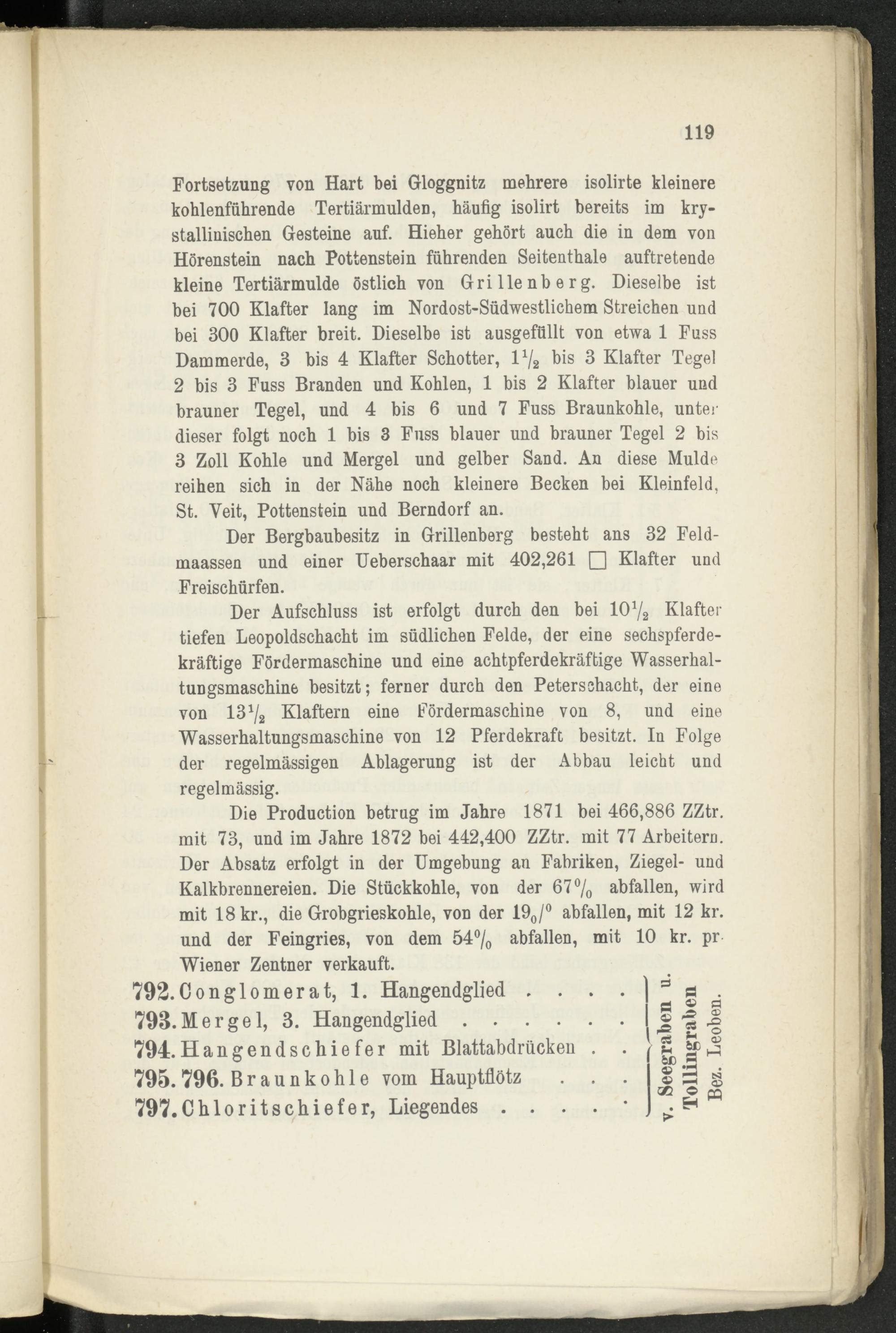 Die Production betrug im Jahre 1871 bei 466,886 ZZtr. mit 73, und im Jahre 1872 bei 442,400 ZZtr. mit 77 Arbeitern. Der Absatz erfolgt in der Umgebung an Fabriken, Ziegel- und Kalkbrennereien. Die Stückkohle, von der 67% abfallen, wird mit 18 kr., die Grobgrieskohle, von der 19 0 /° abfallen, mit 12 kr. und der Feingries, von dem 54% abfallen, mit 10 kr. pr Wiener Zentner verkauft.