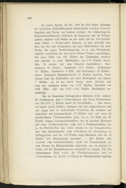 Es wurde bereits bei Nr. 668 bis 670 dieses Katalogs der ländlichen Kohlenführenden Tertiärmulde zwischen Donawitz Sugraben und Prolep bei Loeben erwähnt. Die Ablagerung der Braunkohlenführenden Schichten im Seegrahen und im Tolling- graben schliesst sich östlich an die unter 668 bis 670 bezeich- neten Ritter v. Fridau’schen Maassen an und erstreckt sich über den See und Pructgrahen auf nahe 2000 Klafter bis nach Prolep. Die ganze Tertiärablagerung ist in dem Wartinbergschachte ersichtlich, der auf einem tieferen Punkte angeschlagen, bei einer Tiefe von 107 Klafter das Kohlenflötz erreichte und dasselbe in einer Mächtigkeit von 6*67 Klafter durchfuhr. Es wurden mit dem Schachte durchfahren : Konglomerat 25 Klafter, Sandsteine 16'6 Klafter, Kalkmergel 3’1 Klafter, Sandsteine 2 Klft, und Kalkmergel 50 Klafter; ferner bituminöse Hangendschiefer 10 Klafter mächtig. Unter diesem liegt das Kohlenflötz mit einer Mächtigkeit von nahezu 7 Klafter, sie ist nur durch wenige taube Streifen, und zwar von sandigem Lehm von 0*19 Klafter, Sandstein von 0’03 Klftr. und von O'Ol—0’04 Klafter Mächtigkeit verunreinigt.