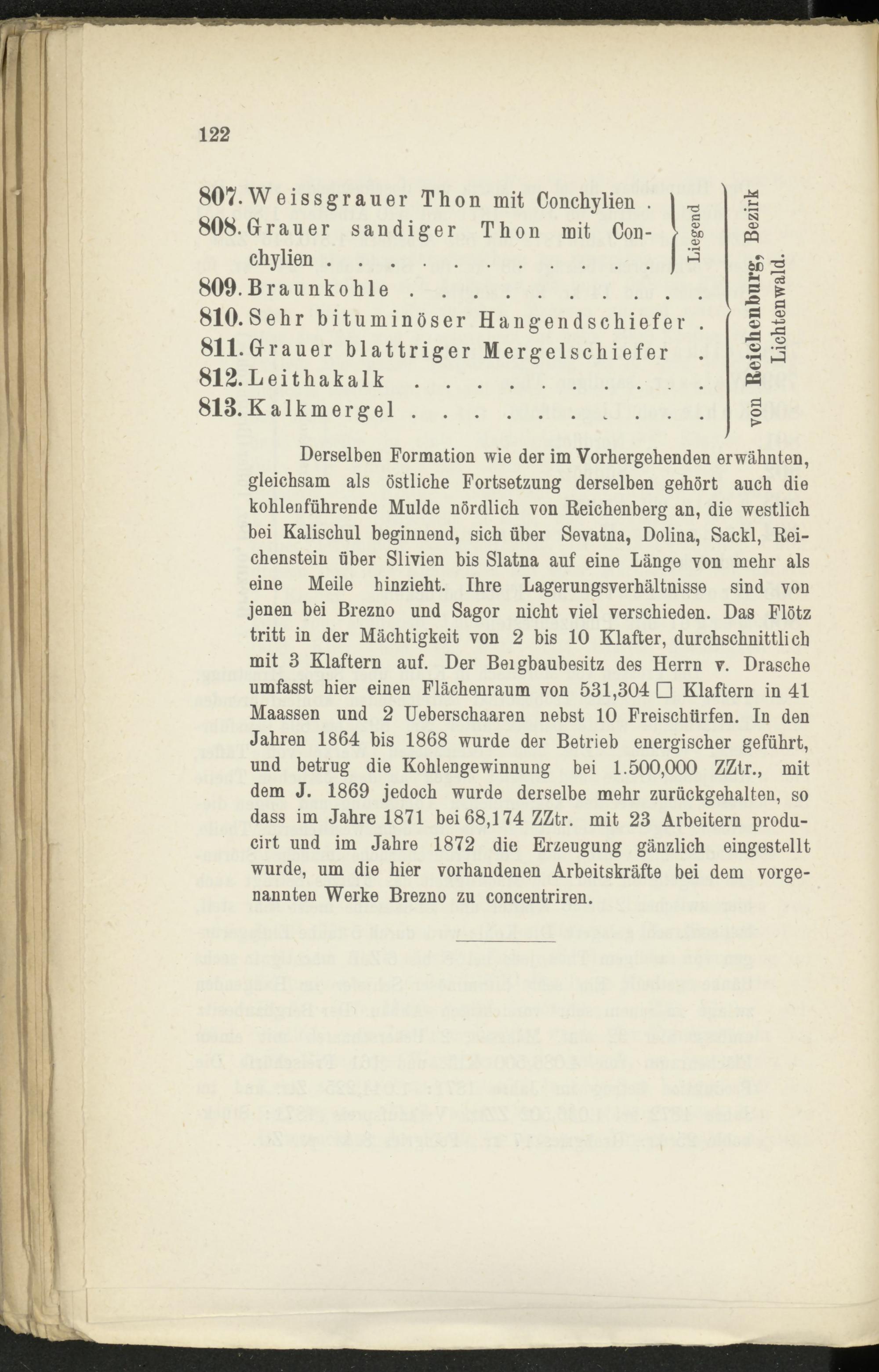 Derselben Formation wie der im Vorhergehenden erwähnten, gleichsam als östliche Fortsetzung derselben gehört auch die kohlenführende Mulde nördlich von Reichenberg an, die westlich bei Kalischul beginnend, sich über Sevatna, Dolina, Sackl, Reichenstein über Slivien bis Slatna auf eine Länge von mehr als eine Meile hinzieht. Ihre Lagerungsverhältnisse sind von jenen bei ßrezno und Sagor nicht viel verschieden. Das Flötz tritt in der Mächtigkeit von 2 bis 10 Klafter, durchschnittlich mit 3 Klaftern auf. Der Beigbaubesitz des Herrn v. Dräsche umfasst hier einen Flächenraum von 531,304 □ Klaftern in 41 Maassen und 2 Ueberschaaren nebst 10 Freischürfen. In den Jahren 1864 bis 1868 wurde der Betrieb energischer geführt, und betrug die Kohlengewinnung bei 1.500,000 ZZtr., mit dem J. 1869 jedoch wurde derselbe mehr zurückgehalten, so dass im Jahre 1871 bei 68,174 ZZtr. mit 23 Arbeitern produ- cirt und im Jahre 1872 die Erzeugung gänzlich eingestellt wurde, um die hier vorhandenen Arbeitskräfte bei dem vorgenannten Werke Brezno zu concentriren.