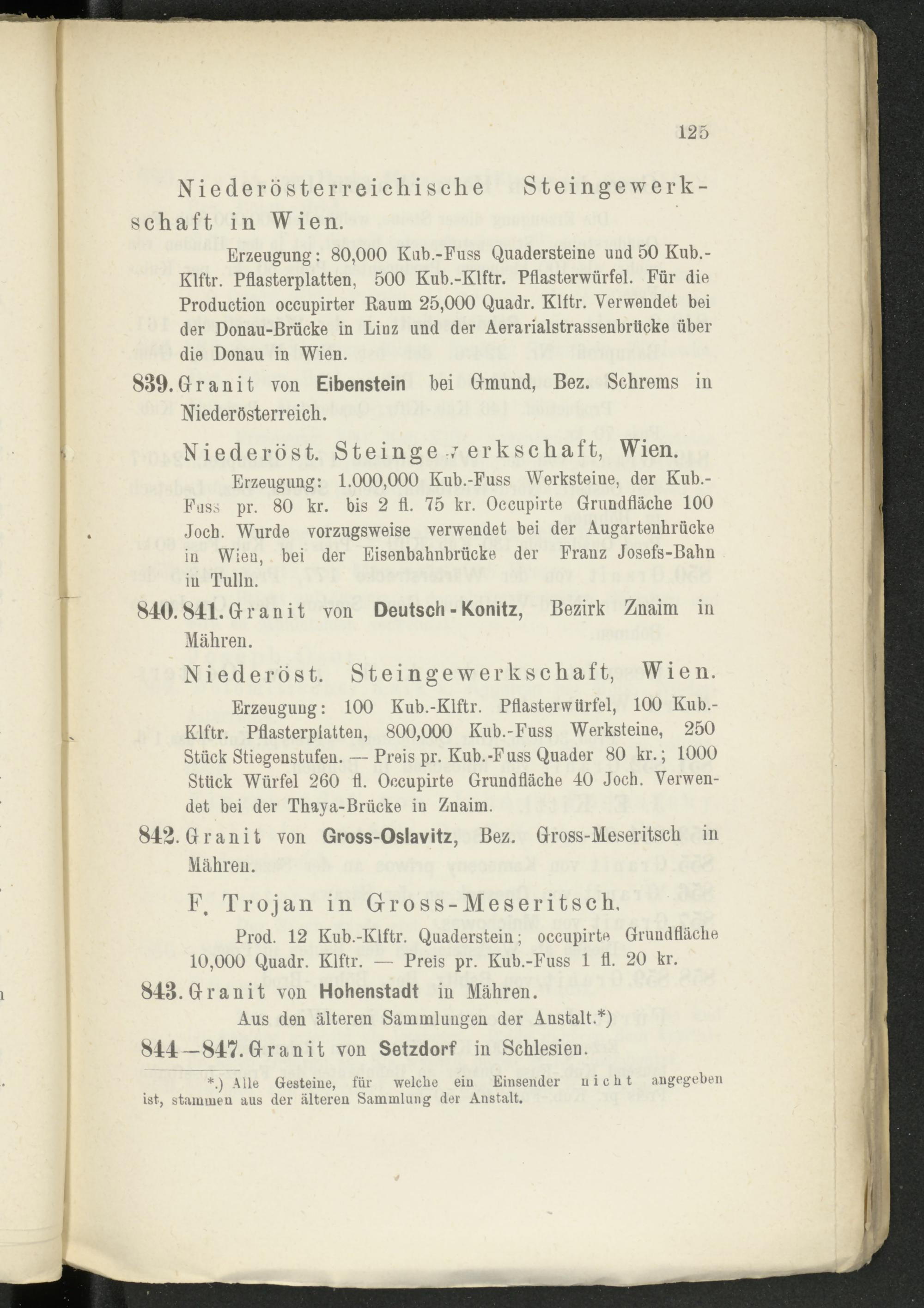 Erzeugung: 80,000 Kub.-Fuss Quadersteine uud 50 Kub.- Klftr. Pflasterplatten, 500 Kub.-Klftr. Pflasterwürfel. Für die Production occupirter Raum 25,000 Quadr. Klftr. Verwendet bei der Donau-Brücke in Linz und der Aerarialstrassenbrücke über die Donau in Wien.