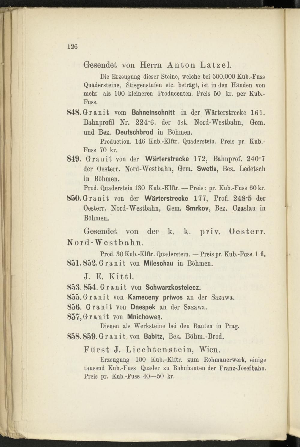 Die Erzeugung dieser Steine, welche bei 500,000 Kub.-Puss Quadersteine, Stiegenstufen etc. beträgt, ist in don Händen von mehr als 100 kleineren Producenten. Preis 50 kr. per Kub.- Fuss.
