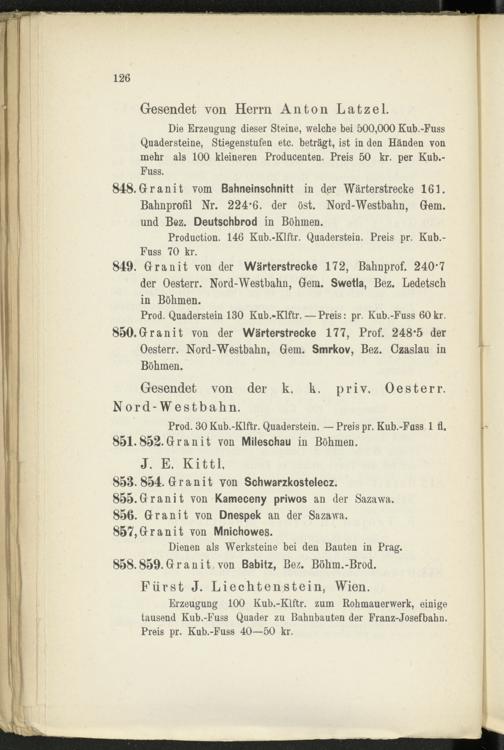 Erzeugung 100 Kub.-Klftr. zum Rohmauerwerk, einige tausend Kub.-Fuss Quader zu Bahnbauten der Franz-Josefbahn. Preis pr. Kub.-Fuss 40—50 kr.