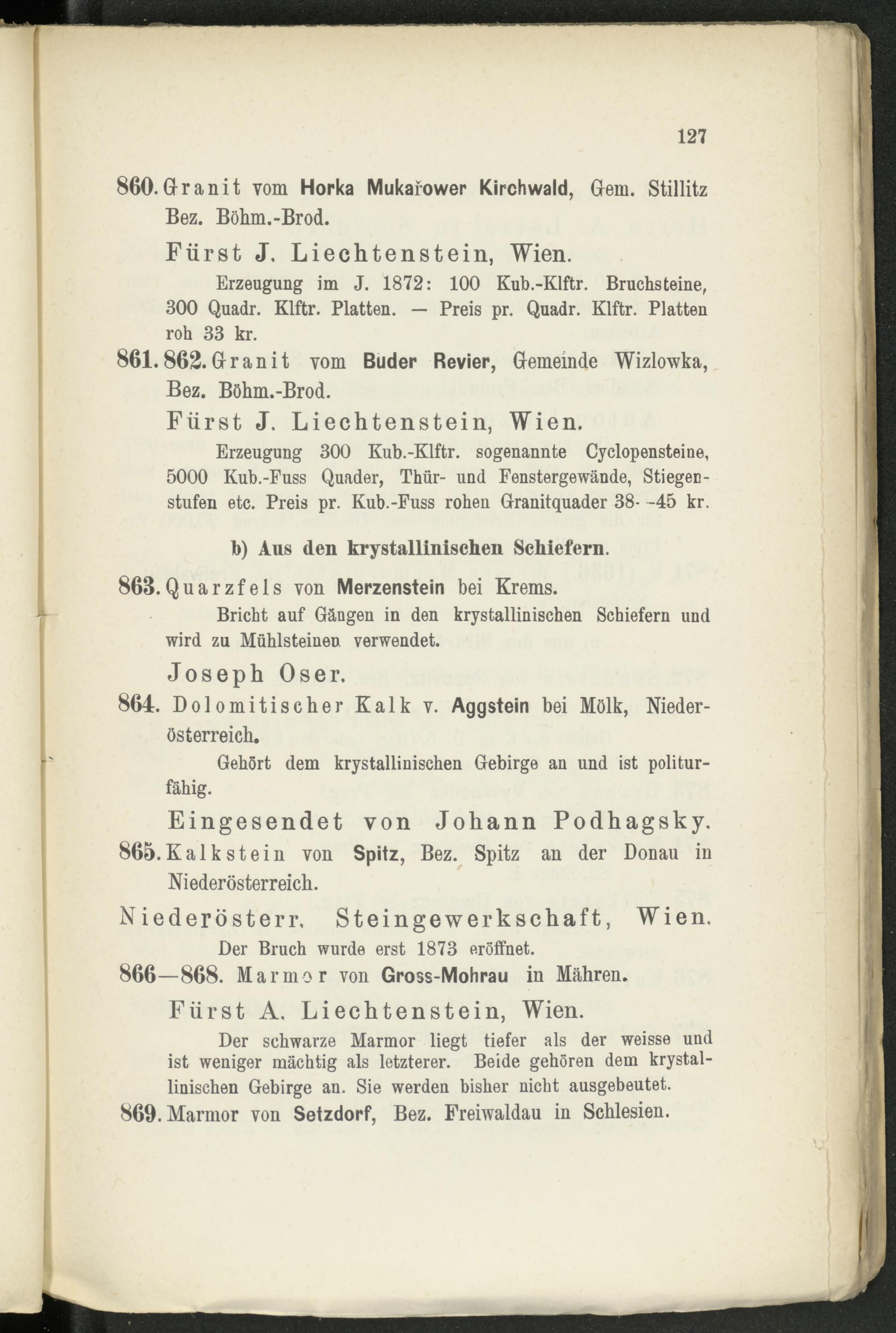 Erzeugung 300 Kub.-Klftr. sogenannte Cyclopensteine, 5000 Kub.-Fuss Quader, Thür- und Fenstergewände, Stiegen - stufen etc. Preis pr. Kub.-Fuss rohen Granitquader 38- -45 kr.