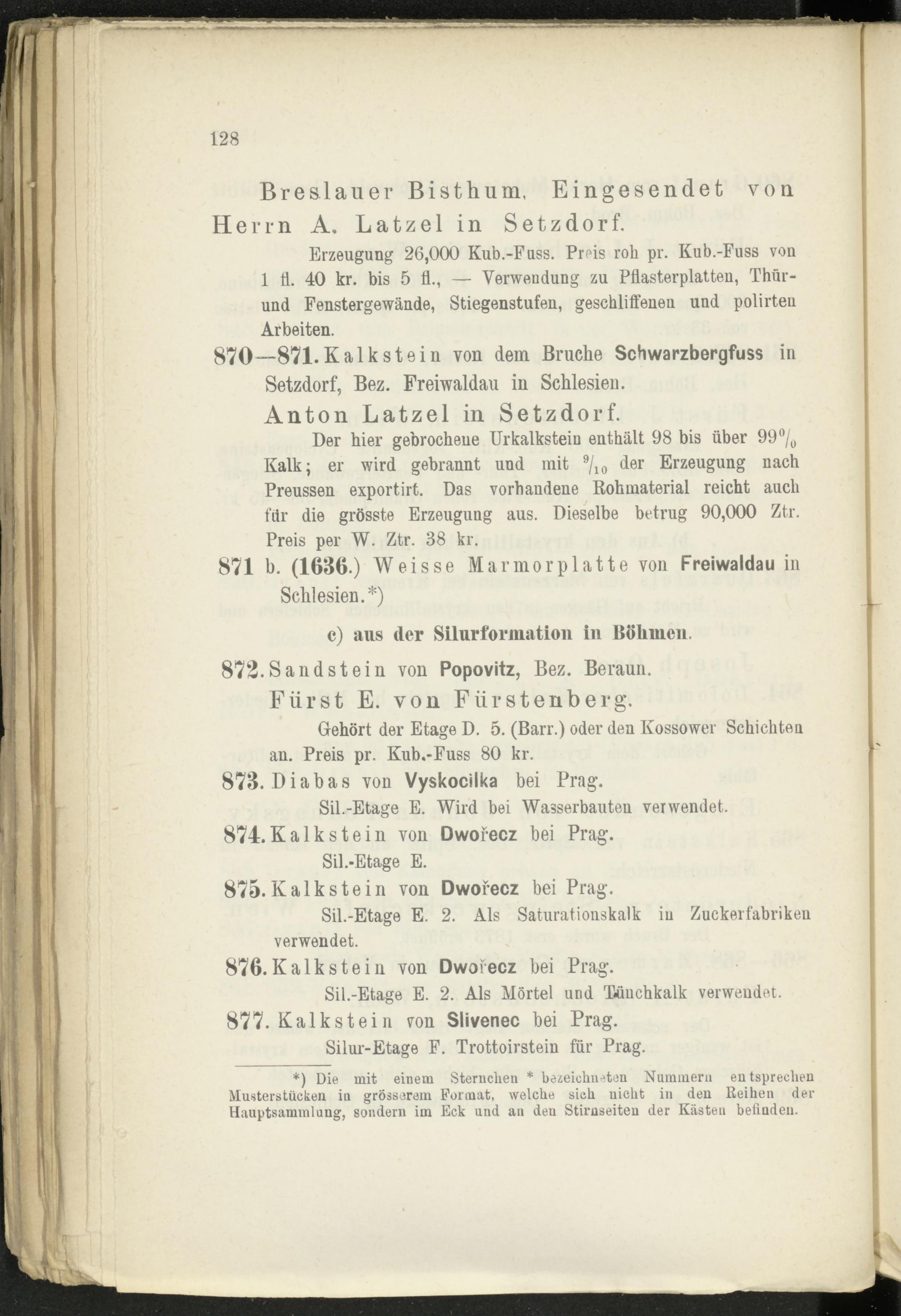 Der hier gebrochene Urkalkstein enthält 98 bis über 99°/ 0 Kalk; er wird gebrannt und mit 9 / 10 der Erzeugung nach Preussen exportirt. Das vorhandene Rohmaterial reicht auch für die grösste Erzeugung aus. Dieselbe betrug 90,000 Ztr. Preis per W. Ztr. 38 kr.