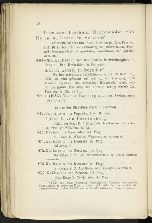 Erzeugung 26,000 Kub.-Fuss. Preis roh pr. Kub.-Fuss von 1 fl. 40 kr. bis 5 fl., — Verwendung zu Pflasterplatten, Thür- und Fenstergewände, Stiegenstufen, geschliffenen und polirten Arbeiten.