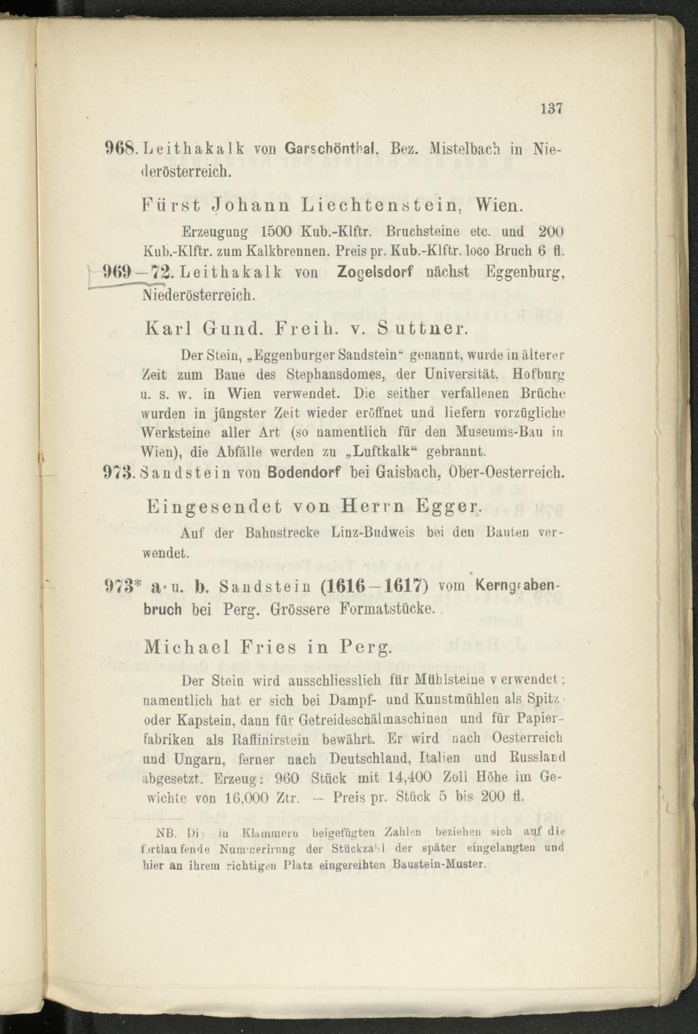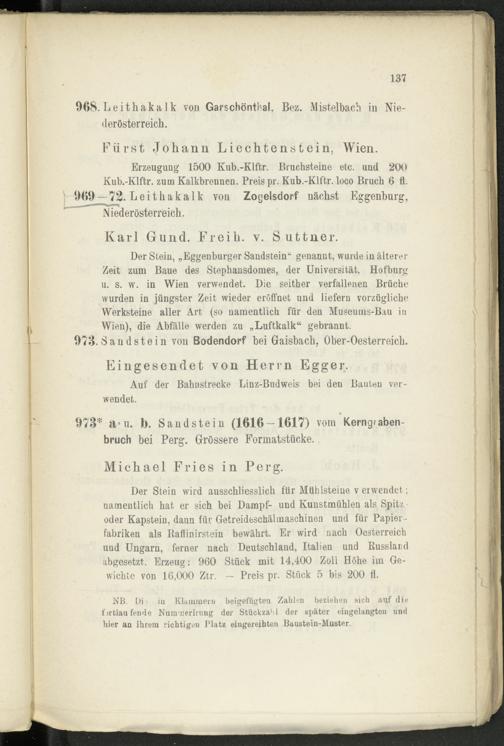 Erzeugung 1500 Kub.-Kiftr. Bruchsteine etc. und 200 Kub.-Klftr. zum Kalkbrennen. Preis pr. Kub.-Kiftr. loco Bruch 6 fl. ) 969—72. Leithakalk von Zogelsdorf nächst Eggenburg, Niederösterreich.