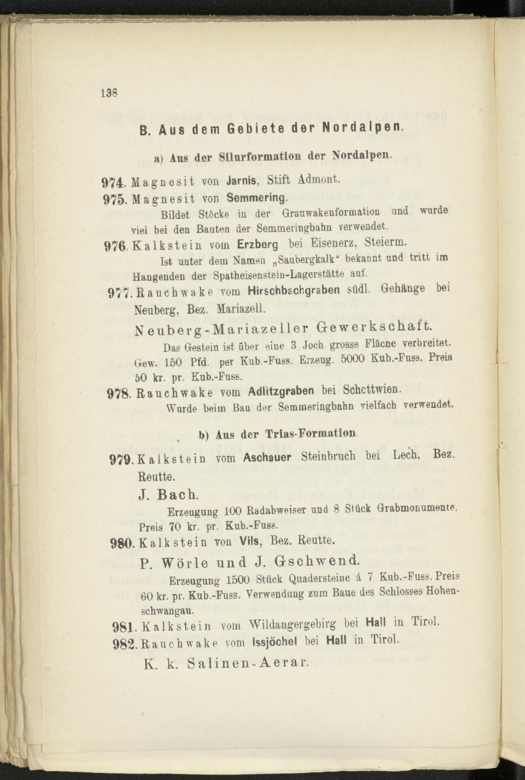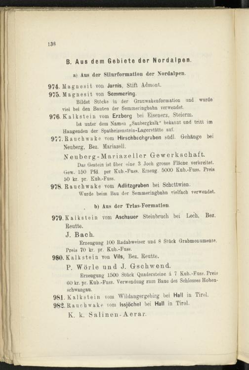 Das Gestein ist über eine 3 Joch grosse Fläcne verbreitet. Gew. 150 Pfd. per Kub.-Fuss. Erzeug. 5000 Kub.-Fuss. Preis 50 kr. pr. Kub.-Fuss.